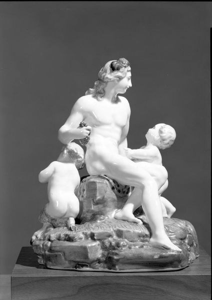Curator: Looking at this delicate porcelain sculpture, I am immediately struck by a sense of unease masked by a superficial charm. Editor: Right, Friedrich Elias Meyer crafted "Asia and Africa" sometime between 1745 and 1765. The Met calls it decorative art, but I see so much more embedded here. Curator: It’s this unsettling juxtaposition, isn't it? Two cherubic figures astride a rather monstrous beast – an ape, perhaps? It's got this glossy sheen, but the scene reads almost violently to me. I am also drawn to its tactile aspect: a smooth yet deeply expressive work, inviting curiosity and further interaction. Editor: That "beast" as you call it, acts as a visual shorthand for colonial attitudes towards the continents. These cherubs – representing Asia and Africa respectively—are infantilized, their power, potential, or perceived threat, diminished. Meyer made these out of porcelain for a reason, to present an allegorical story about domination in what was seen as an easily controlled and aesthetically pleasing medium. Curator: Domination neatly packaged, indeed. And the rococo flourishes--all those frills. It’s fascinating how aesthetic pleasure can obscure some of the more problematic underpinnings. Editor: Exactly! Rococo’s playfulness, its elegance and charm become a smokescreen. You almost miss the problematic power dynamics being portrayed through each meticulously crafted curve. The figures themselves are based on idealized European notions rather than any authentic representation. Curator: This conversation brings into light how the sculpture reflects a worldview and perhaps invites further introspection on colonial practices that had some connection to this artwork at the time of production. Editor: It does, revealing so much about eighteenth-century European perceptions and biases. By critically examining seemingly harmless objects, we gain insights into historical ideologies that still resonate today. It serves as a stark reminder that aesthetics are never neutral.