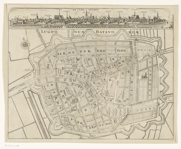 Christiaan Hagen created this print titled "Plattegrond van Leiden" – a segment of Leiden’s map – around the late 17th century. The visual experience is dominated by meticulously drawn lines that articulate the city's layout, with a relatively uniform texture broken only by the subtle gradations of shading, creating depth and form. The use of orthogonal projection creates a flattened space where buildings, waterways, and fortifications are laid out in a precise, grid-like pattern. The map serves as a structured representation of space, employing a system of signs to denote urban elements. Hagen’s rendering also includes allegorical figures, perhaps nodding to classical ideals of order and knowledge, which serve as cultural markers that frame the city's identity. This map embodies a will to order and categorize the world, reflecting the scientific and philosophical underpinnings of the Enlightenment. It presents Leiden not just as a place, but as an idea – a structured, rational entity.