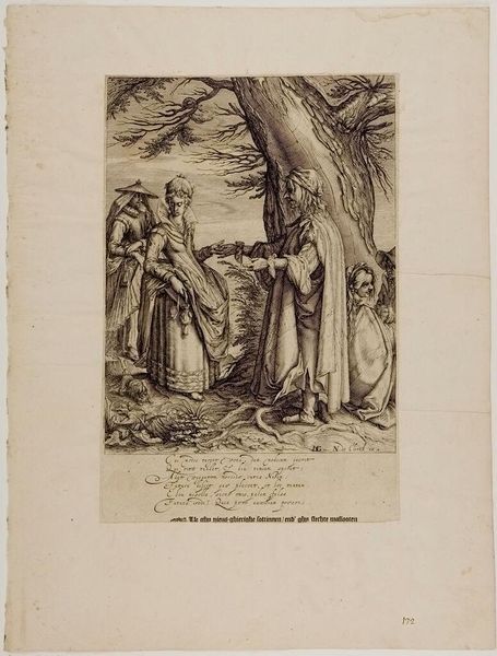 Curator: Fritz Syberg created this drawing in 1897; it's called "Hvor skal jeg finde Døden...", or "Where Shall I Find Death...". It appears to be ink on paper. Editor: Immediately, the composition strikes me. It’s this stark, almost bleak scene, with two women centered but seeming quite isolated. The scratchy linework contributes to the somber mood; everything feels a bit… withered. Curator: Let’s dig into the means of its making: pen and ink, typically a medium for sketches or illustrations. Consider the dense cross-hatching; the labour invested in building up the tones suggests Syberg saw the print almost as a type of social document, highlighting the interaction and work of these figures. Editor: You’re right; there's something intensely material in how Syberg built those tones. Looking at it through the lens of narrative, the text beneath the drawing seems crucial. I read that it recounts the despairing plea to find a lost child and the unsettling exchange with what I interpret as grim reapers/death figures, one who's an elderly gravedigger and the other appears to be Moses from his signature to that exchange. The text adds layers of existential questioning and grief. How do these women fit within their intersectional spheres and personal journeys of grief? Curator: Precisely, considering the social context, these are working-class women, and the materiality of their world – represented by the bare trees and withered foliage – it mirrors a harsh social reality. We have this direct record in front of us because of the ink on paper and a moment memorializing Syberg's observations of his local sphere of social commentary. The composition choices, medium, and visual/text elements lead towards highlighting life's fragility with their environment; a stark comparison. Editor: This is less about heroic ideals, perhaps, and more about revealing something about female perseverance in the face of loss and decay. It pulls back from artifice. Curator: Absolutely. Syberg’s artistic process and choice of accessible materials serve this end: bearing witness to social dynamics without romanticism or the classical expectations of high art. Editor: Seeing it this way changes my perception completely. It shifts from a melancholic scene to a raw statement on labor and its impact within society, and this work’s materiality becomes a powerful voice. Curator: It encourages us to question how meaning itself is crafted, who dictates these means of production, and whose experiences ultimately are valued when we consider the cultural impact and social class divisions.