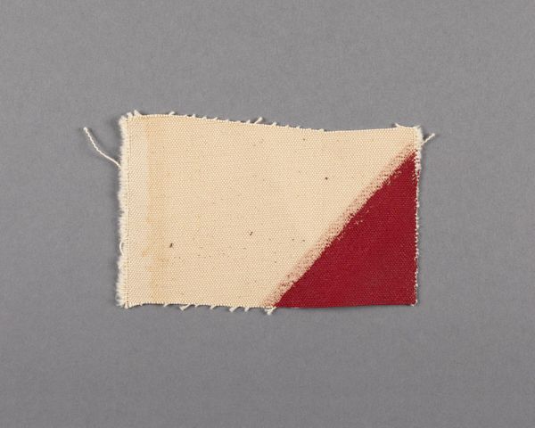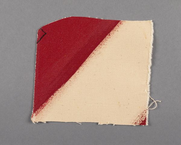 Editor: This is a fragment of painted canvas by Barnett Newman, held at the Harvard Art Museums. The stark contrast between the white stripe and the red field feels almost confrontational, considering its small scale. What do you make of it? Curator: Fragments offer unique insights. Here, the raw edges and limited palette invite us to consider the artwork as a potential act of resistance against traditional notions of artistic completeness. How does the incomplete nature of the piece inform your understanding of Newman’s artistic intentions? Editor: I see it now. It challenges our expectations, prompting us to question what constitutes a finished work. Curator: Precisely. It reflects Newman’s commitment to pushing boundaries, inviting dialogue about art’s role in social and political discourse. Editor: I never thought a small fragment could hold so much. Curator: It’s a reminder that art’s power lies not just in its final form, but in the questions it provokes.