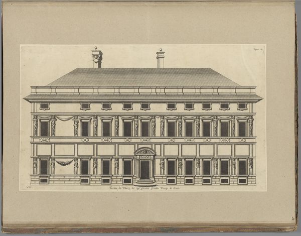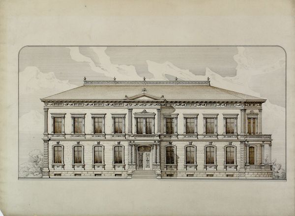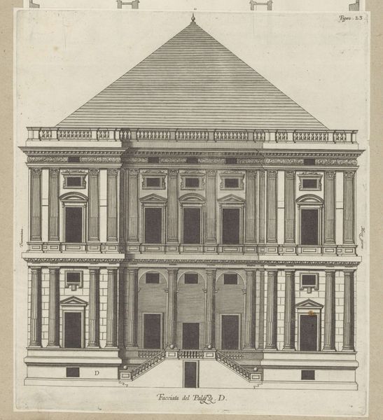 This drawing of a two-story palace facade was created by Pietro Paolo Coccetti, likely in the early 18th century, using pen and brown ink with gray wash over graphite on paper. It's fascinating to consider the labor and materials involved, even in this preparatory stage. The graphite underdrawing, the careful application of ink, and the subtle gradations of the gray wash, all speak to a process of meticulous refinement. This wasn’t just about sketching an idea; it was about visualizing a future reality, a building that would itself require tremendous amounts of labor to realize. The drawing itself is a kind of performance, mediating between the patron's aspirations, the architect's vision, and the many artisans who would ultimately bring the palace into being. It’s a reminder that even seemingly simple materials can be imbued with layers of social and cultural significance. Examining this work in terms of its materials, making, and context expands our understanding of the distinctions between fine art, design and the skilled trades.