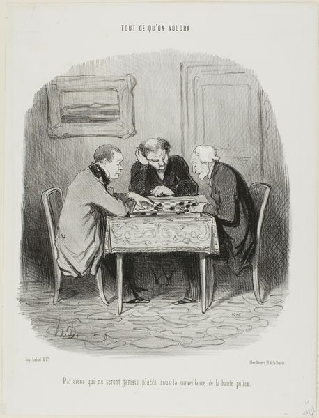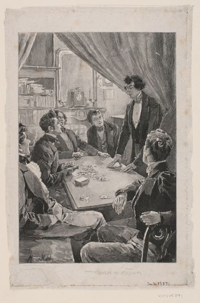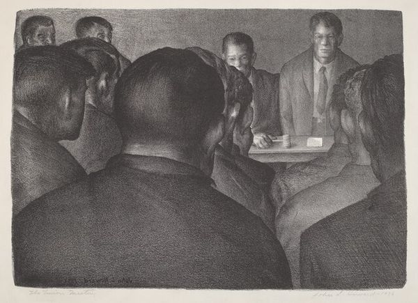 Curator: Before us is Charles Alston's print "Stud Poker," created sometime between 1933 and 1943, now held here at the Metropolitan Museum of Art. What’s your initial reaction to it? Editor: It feels tense, almost theatrical. The sharp contrasts of light and shadow really amp up the drama of this supposedly casual game. Curator: Alston created this print during the Great Depression and it offers a window into African American life at that time. Note how he situates the figures—an interplay of closeness and isolation, around a table. Can you elaborate on how the historical and social context inform how we view this piece? Editor: Precisely. Knowing that context helps us understand "Stud Poker" beyond a simple genre scene. These figures, rendered with such intensity, become symbols of resilience amidst economic hardship and racial inequality. The game itself is a potent metaphor for risk, strategy, and survival under pressure. Curator: And it’s worth noting Alston’s grounding in the Harlem Renaissance, with echoes of social realism and regionalism. The setting and clothing read as deliberately chosen signifiers, rooted in lived experience, while also connecting to art historical conventions for depicting working class people in shared cultural pursuits. Editor: I also find the perspective compelling. The figure standing behind, seemingly an observer, perhaps even an enforcer, complicates the dynamics further, suggesting hidden power structures are in play, even within a community portrayed as playing a seemingly informal game. Curator: It prompts us to reflect on representation itself—who is seen, how, and why. How Alston captures the nuances of their facial expressions and gestures tells of far more than simple gambling—they hint at shared struggles and individual anxieties, challenging stereotypes by asserting their humanity. Editor: Absolutely. Considering "Stud Poker" alongside Alston's other work gives even deeper insight. We are invited to see this gathering as an assertion of presence and identity within larger, often hostile social landscapes. This is where history really amplifies the resonance of an artwork. Curator: This print also demonstrates Alston’s sophisticated engagement with genre conventions. His work operates in a long lineage of visual depictions depicting everyday life while investing it with social and political weight. Editor: Yes, the work stands as an eloquent reminder that art is not made in a vacuum but carries echoes of collective memories and aspiration, inviting continuous conversations about community, representation and the complex relationships between play and perseverance. Curator: Precisely. Hopefully our reflections shed new light on the depth and complexity contained within this piece. Editor: Indeed, a rewarding journey through "Stud Poker".