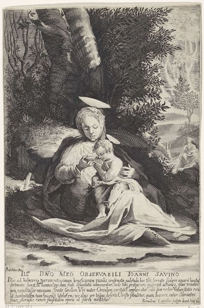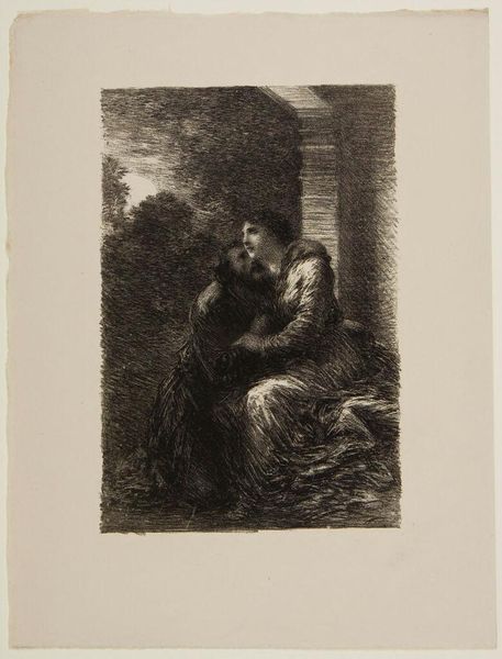 Editor: This is "Fetching Water" by Thomas Nugent, currently held at the Harvard Art Museums. It's a print showing a woman carrying a child and a water jug. What strikes me is the tonal range and composition. What do you see in the way the artist uses light and shadow? Curator: Nugent’s success here is found in the strategic manipulation of chiaroscuro. Observe how the graded tones articulate form, creating a tactile sense of volume. The light isn't merely illuminating; it's structuring the pictorial space, directing the eye. Note how the light catches on the jug, anchoring the composition. Editor: That's fascinating! I hadn't considered the jug as a focal point through lighting. Curator: Indeed. The materiality of the print itself also commands attention. Consider the texture achieved through the mezzotint process, allowing for these subtle gradations. The medium is integral to the message. Editor: I’ve definitely learned to look more closely at the artist's tools and techniques. Curator: And I, at the immediate emotional impact an image can have. Thank you.