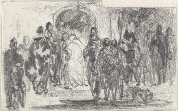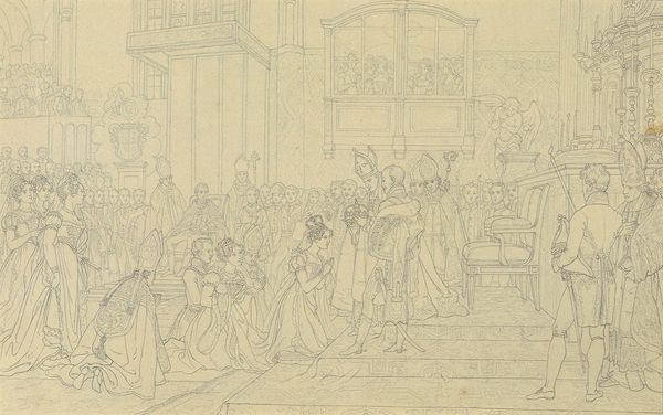 Editor: Here we have "A Christening in Chevening Church, Kent," a pen drawing by Benjamin West. I am struck by how light and airy the composition feels despite being rendered in such detail. What stands out to you about this piece? Curator: The architectural framework commands attention. Note the masterful delineation of lines, forming the church's structure, replete with intricate column designs and expansive windows. This deliberate structure invites reflection on the interplay between the geometric shapes and the soft human forms gathered within. How does the church building's structural rhythm relate to the assembly of figures at the christening? Editor: It almost feels like the architecture dwarfs the people within, making the christening seem almost insignificant. Is that intentional, do you think? Curator: It's less about insignificance, and more about scale and contrast. Consider how West utilizes linear perspective to emphasize the church's depth, contrasting it with the comparatively compressed space occupied by the figures. There is visual tension between vertical aspiration and the communal gathering at the human scale. This contrast emphasizes the human experience contained and framed by architecture. What affect do you believe the structural details of the architecture and their visual impact create? Editor: The attention to detail creates a kind of quiet reverence and reinforces the importance of both setting and scene. I'm seeing the structural organization more clearly now. Curator: Precisely! This focus on structural form—the strategic deployment of line and architectural construction—becomes not merely representational but formally evocative. It elevates what might be mere narrative to visual and material engagement. Editor: Thank you; I had initially missed that the linear detail gives shape to our understanding and elevates a snapshot of an event into something meaningful.