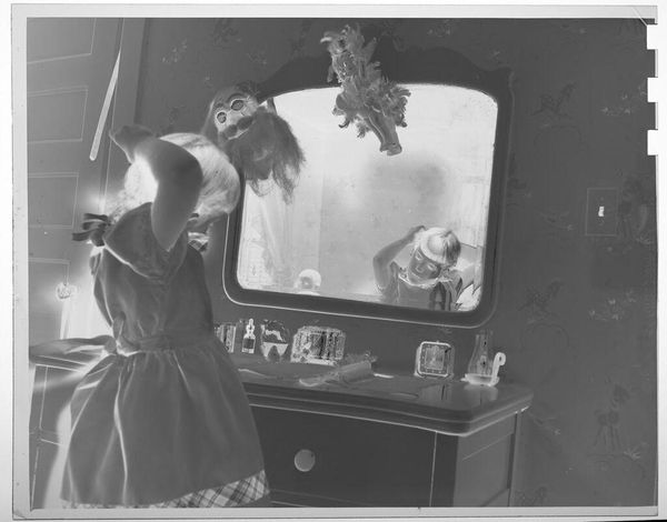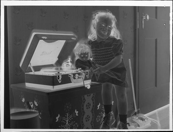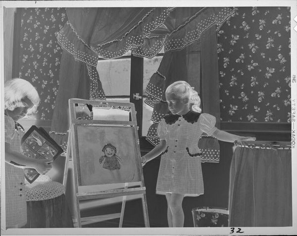 Editor: This is an untitled photograph, "two girls and easel," by Lucian and Mary Brown. It’s a small black and white image of two young girls and, to me, it feels very intimate. What do you notice in terms of its composition? Curator: The interplay of light and shadow, particularly the way the negative space defines the subjects, is quite striking. Note how the artist directs our gaze through the careful arrangement of forms. Editor: So, it's about the shapes and light, not just the subject matter? Curator: Precisely. The contrasting textures – the girls' patterned dresses against the stark easel – create a visual rhythm. Editor: I see it now; it's like the photograph is its own little world. Curator: Indeed, and it’s a world constructed through careful formal choices.