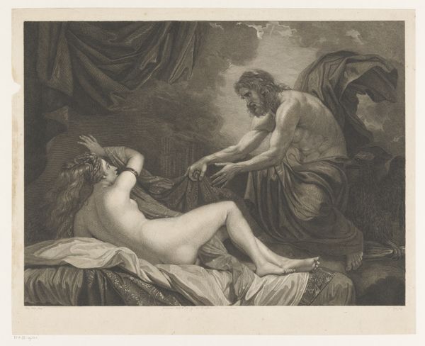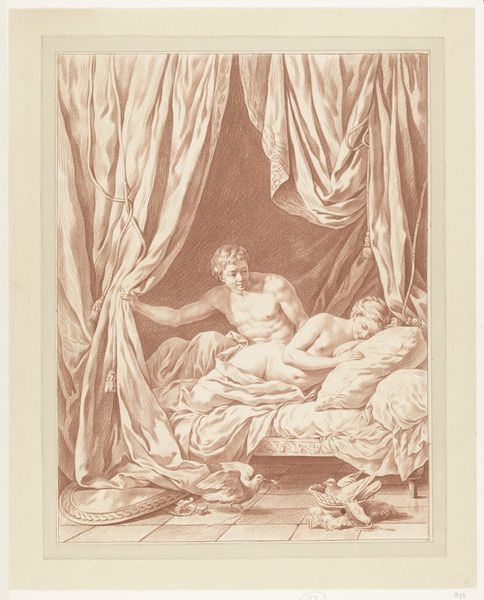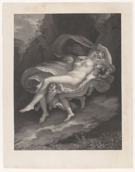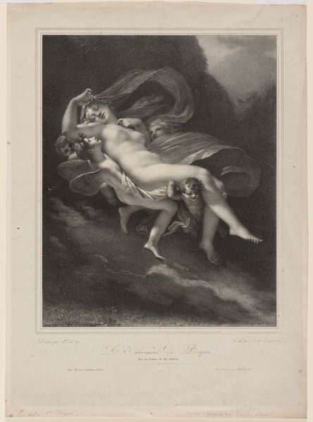 Editor: Here we have Hyacinthe-Louis-Victor-Jean-Baptiste Aubry-Lecomte's 1824 drawing, "Psyche Ascending to Olympus," rendered in pencil and graphite. The ethereal figures caught my eye; the way they’re arranged seems so carefully considered. What compositional elements stand out to you? Curator: The composition strikes me foremost through its dramatic use of chiaroscuro. The strong contrasts enhance the voluminous forms, particularly the corporeal figure of Psyche and surrounding cherubic forms, all rendered using only line and tonal gradation. Note the artist’s emphasis on these figures arranged into complex arrangements in a space largely defined by ambiguous dark tonal values. What does this limited palette emphasize for you? Editor: It focuses my attention on the surface quality, the pure forms. I also notice that the figures, despite their softness, almost seem to defy gravity; how does this element function? Curator: The lack of defined space—a formal feature—serves to accentuate a weightlessness and lack of depth. In this regard, consider how the implied diagonals reinforce the sense of upward movement. We note the emphasis on carefully modeled anatomy set against amorphous shapes in dark pencil and graphite. There is an inherent contrast that reinforces visual interest here; it is something beyond surface meaning. Do you agree? Editor: I think so. The artist plays with contrasts and carefully choreographs forms on a flat surface, and that generates this powerful image, that may tell us something profound about the act of image making. Curator: Precisely. By analyzing solely what we see on the surface, we unveil core components of this piece beyond merely historical considerations, and we illuminate Aubry-Lecomte's talent with just line and tone.