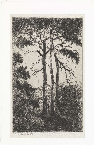 Editor: This is "Vrouw in een duinlandschap," or "Woman in a Dune Landscape," by Arnoud Schaepkens, likely created sometime between 1831 and 1888. It's a pencil drawing on paper, and what strikes me immediately is the starkness, the contrast between the delicate figure and the wildness of the dunes. What do you see in this piece? Curator: Beyond the immediate landscape, I see a meditation on the position of women within the natural world and broader social structures of 19th-century Netherlands. Consider the historical context: burgeoning industrialization, shifts in gender roles, and the romantic idealization of nature. Where does this woman fit? Is she empowered by her connection to the land, or dwarfed by it? Editor: That's fascinating. I hadn’t considered the industrialization aspect. It makes the landscape feel almost like a refuge, but one she's still somewhat isolated within. Curator: Precisely. Look at the rendering of the figure. She is small, almost swallowed by the density of the landscape. Think about feminist theory and the concept of "otherness." Is she being presented as separate from, or perhaps dominated by, this natural world? Does this separation extend into societal power structures? How might her class or societal expectations play a role in her perceived isolation? Editor: So, it’s not just a pretty landscape; it's a commentary on a woman's place within society at the time. I suppose the roughness of the sketch even emphasizes the struggle for recognition. Curator: Absolutely. Schaepkens may be subtly questioning the romantic ideal by showing the stark realities faced by women. What did you make of the signature? Is the act of identifying as an artist in the context of limited cultural enfranchisement an act of defiance? Editor: Wow. I definitely have a richer appreciation for this drawing now, seeing how it invites questions about identity and historical context. Curator: Indeed, art can act as a profound catalyst for thinking critically about power, gender, and societal evolution.