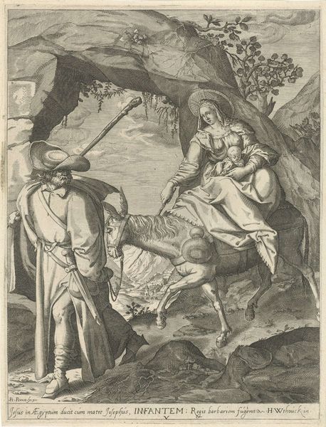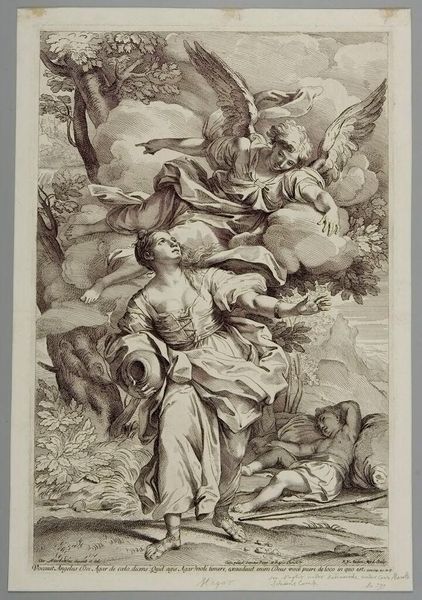 Fabio Berardi etched this Rest on the Flight into Egypt in the 18th century. At its heart, we see the archetypal symbol of refuge: a family seeking shelter, watched over by divine entities. Note the angel hovering above, a motif that stretches back to antiquity, representing divine intervention. It's a gesture akin to the protective deities found in Roman and Greek art, where winged figures signal a link between the earthly and the celestial realms. Joseph is carrying the child, mirroring ancient depictions of fathers protecting their offspring, a theme universal across cultures. The act of seeking rest, as depicted here, also resonates deeply, calling to mind the cyclical nature of life's journeys. The image taps into collective memory, reminding us of shared human experiences of vulnerability and the search for safety. The flight becomes a metaphor for the continuous human quest for sanctuary.