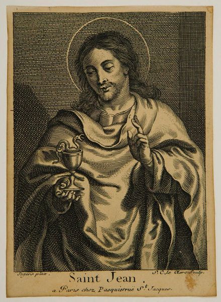 Curator: Looking at this engraving from circa 1640-1680, housed right here in the Rijksmuseum, one can truly admire Cornelis van Caukercken’s technical skill in capturing the somber “Johannes.” Editor: It strikes me immediately how still the whole piece is. The dark shading in the background adds to a very serious, almost tragic mood. Curator: This particular print showcases an interesting dissemination of artistic styles. Based on an earlier painting by van Dyck, Caukercken reproduces van Dyck's original portrait but translated through the graphic language available to a baroque engraver. It raises interesting questions regarding access, reinterpretation, and popular piety during this era. Editor: Absolutely. And the chalice is a key element. Traditionally, the chalice appears in iconography to identify Saint John the Evangelist and symbolize the Eucharist and divine grace. Here it feels heavy with symbolic meaning, almost burdensome. Curator: Yes, the somber tone would fit interpretations that this refers to Saint John the Apostle who, as the legend states, was presented with a poisoned cup. Editor: Interesting. It's remarkable how the visual language around particular saints and figures evolve, especially within specific historical and political climates, reflecting ever changing understandings of divinity and mortality. Curator: Precisely. Religious prints like these circulated widely, offering a personal experience of the sacred, as opposed to only grand altarpieces commissioned by the church. These small scale engravings found a larger audience outside traditional elite patrons. Editor: This allows us insight into baroque anxieties, especially the relationship between humanity, belief, and inevitable suffering. Curator: Examining prints such as "Johannes", grants access to the past by letting us investigate the cultural and political stakes through their widespread distribution. Editor: I am reminded of how symbols persist to help reveal hidden layers of humanity’s emotional and spiritual memory.