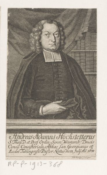Editor: Here we have an engraving titled "Portret van Henricus Velsen" by Ernst Ludwig Creite, created sometime between 1744 and 1765. It's striking how detailed the lines are, especially for an engraving. What do you see when you look at this portrait? Curator: This piece speaks volumes about the societal values of the time, doesn't it? The Baroque era was a period defined by ornamentation and grandeur, but also, importantly, a rigid social hierarchy. This portrait isn't just an image of a man; it’s a constructed representation of authority and status. Consider how the inscription positions Velsen in relation to "God" and the "Inlandsch Pronk-Gesteente," locating him within discourses of faith and nation. Who was Velsen? How do you interpret his representation within the historical context of Dutch society during this period? Editor: From the inscription, it seems he was a prominent figure in the Hague church community. Perhaps the artist used the conventions of portraiture to underscore Velsen’s respectability? Curator: Precisely! The choice of engraving, a medium often used for disseminating information and celebrating public figures, elevates Velsen. His pose and attire speak to this performance of status, but also point to broader questions about religious authority, social standing, and the visual languages employed to maintain such structures. The very act of memorializing him in this way highlights the cultural and ideological work portraits performed in 18th-century Dutch society. Editor: That makes me see the portrait not just as a likeness, but as a carefully crafted statement about power and societal roles. Curator: Exactly. By understanding these visual codes, we can begin to deconstruct the messages these images convey about class, belief, and the historical moment in which they were created. Hopefully this helps us connect the historical artwork with our world today.