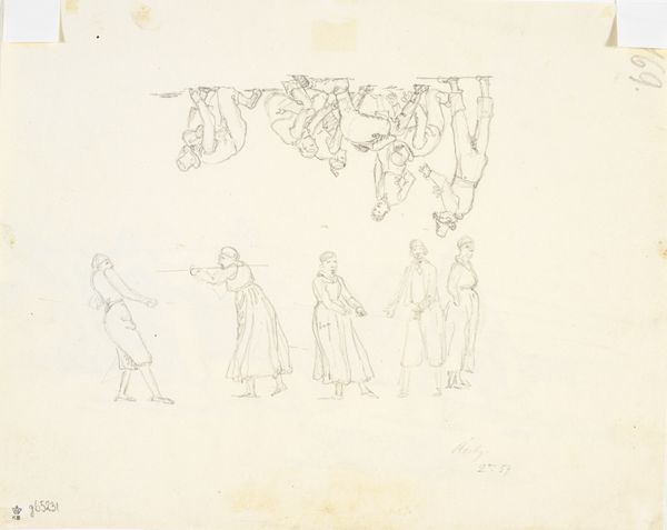 Franz Jakob Kreuter created this undated sketch, titled "Figures in Historical Costumes," using graphite. Kreuter lived through a period of significant social and political upheaval in Europe. The sketch presents a tableau of figures and symbols that evoke a sense of history and identity, hinting at a narrative steeped in cultural memory. The figures in historical dress, coupled with heraldic symbols, may reflect the artist's interest in the past. The rendering of the figures seems to idealize historical subjects, evoking nostalgia for a bygone era. This is an artistic interpretation influenced by the romanticism prevalent in 19th-century European art, which often looked back to the medieval period for inspiration. The act of sketching itself is an intimate encounter with history, mediated through the artist's vision. It speaks to how we construct and relate to historical narratives and identities.
