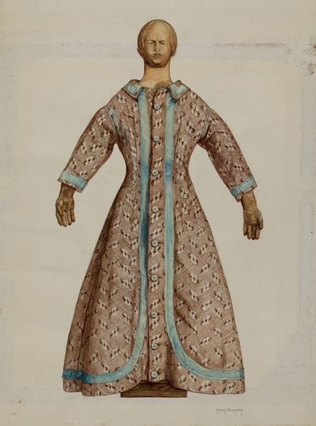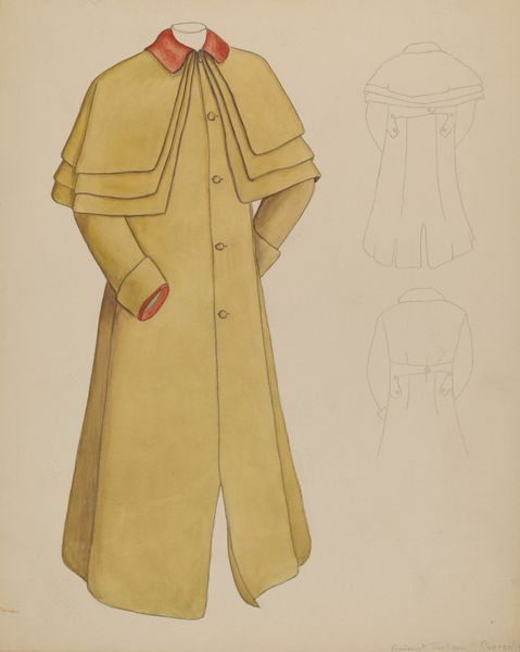 Jessie M. Benge's "Coat" presents a striking study in colour and form, achieved with watercolour and graphite on paper. The dominant indigo blue of the coat is neatly offset by the careful use of a mauve trim and the ochre ground, creating a subdued yet compelling visual harmony. Benge's approach to design seems steeped in structuralist thought. She uses the basic semiotic elements to investigate the very essence of 'coat-ness'. The meticulous lines and proportions give a sense of functionality, while the sketch on the right deconstructs the garment into its barest form. It is almost an investigation into the 'grammar' of clothing design. Note how the artist’s method destabilizes traditional values of representation. She does not render a coat but investigates the idea 'coat' as an object of utility and aesthetic consideration. The result is a thoughtful exploration of design, inviting us to reconsider the meanings we ascribe to everyday objects.