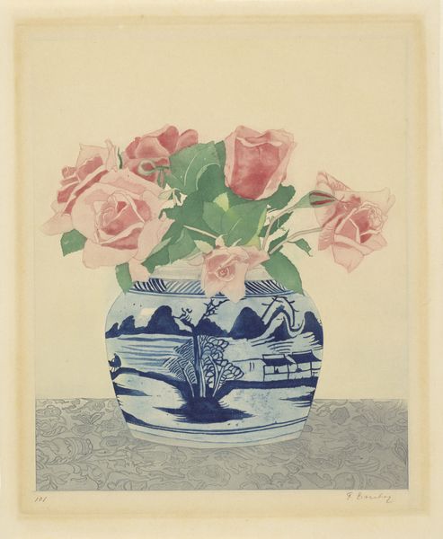 This is Henri-Charles Guérard’s ‘Brief naast een vaas met roos’, a print of a rose in a glass vase with a letter next to it. The print was made using etching and aquatint, processes involving coating a metal plate with a waxy ground, then using needles to expose the metal before immersing it in acid. Look closely, and you will see that the image isn’t created using traditional mark-making, like drawing. Instead, the textures and tones are achieved through a subtle chemical action. This endows the work with its soft, almost ghostly quality. Aquatint allows for broad tonal areas, creating a wash-like effect. Guérard was interested in the alchemical potential of printmaking, which was then undergoing a revival. New techniques were celebrated for their ability to mimic the effects of painting and drawing. Yet, here, the appeal comes from the way the process itself seems to breathe life into the image. This print serves as a reminder of the depth of artistry involved in printmaking, elevating it beyond mere reproduction and revealing its unique aesthetic language.