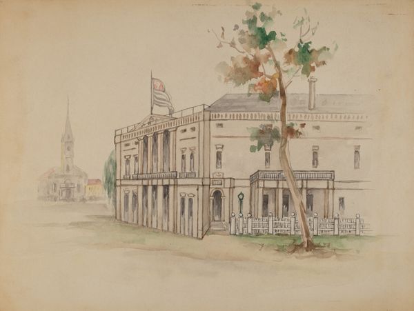 Curator: Welcome. Today we’re looking at "House with Flag," a watercolor and ink drawing on paper, made sometime between 1935 and 1942. Editor: It’s… wistful. There’s a fragility in the rendering, especially the washed-out colors, that gives it an air of memory. Curator: Indeed. The application of watercolor creates a muted palette, perhaps commenting on the socio-economic atmosphere of its time, potentially reflecting scarcity during the depression era, influencing the choice of modest materials like paper and watercolor over more expensive oils. Editor: The composition directs my eye from the flag down the rigid lines of the house to the organic form of the tree on the right. I like how that lone tree contrasts with the geometrical severity of the building; it lends some balance. Curator: Right. Notice the artist's hand. The quick, repetitive strokes indicate efficiency but perhaps also the constraints imposed on artists during the period, limiting their access to studio space or finer materials. We must also consider that it is unsigned. Editor: While unsigned, it presents a unique formal study. The delicate balance achieved through a subdued color palette is carefully offset by a well-defined structural depiction of architecture. The slightly off-center positioning of the building— Curator: It subtly implies the human element and a touch of spontaneity; that would normally suggest an external commissioner who controlled creative decisions to the artist. The paper substrate itself is a product of industry, which emphasizes access and affordability of creative materials in an age increasingly defined by consumption. Editor: The drawing compels reflection on national identity in this period with some uncertainty. Despite the presence of the flag, its somewhat faded appearance suggests a degree of questioning toward patriotism or authority. Curator: The artwork exemplifies how everyday materials became the canvas of socio-political and individual sentiment in response to larger social movements of that period. This resonates far beyond mere aesthetics, telling narratives about our interaction with making art during uncertain times. Editor: Ultimately, the tension between structure and nature in "House with Flag" leaves the viewer contemplating broader themes of societal progress, as well as what compromises people had to face with that "progress."