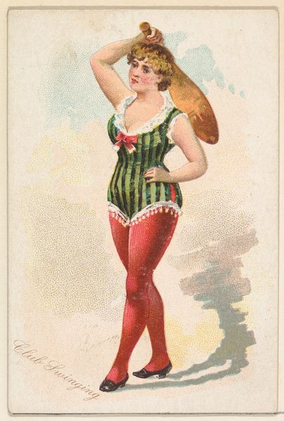 This small chromolithograph was produced by W. Duke, Sons & Co. in the late 19th century, as part of a series of collectible cards included in cigarette packs. Here, we see an image of a woman climbing a rope. The color lithography process allowed for the mass production of brightly colored images, making them ideal for advertising. The card is a fascinating example of how images of athleticism and leisure were used to promote tobacco consumption. The print's flat, graphic style, with its emphasis on line and color, speaks to its industrial origins. It was designed to be eye-catching and easily reproducible on a mass scale. This all reflects the growing industrialization and consumer culture of the late 19th century, where even leisure activities became commodified. The production of these cards involved a significant amount of labor, from the artists who created the original designs to the factory workers who printed and packaged them. Considering the materials, production processes, and social context encourages a deeper understanding of the artwork's place in history.