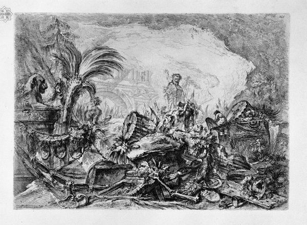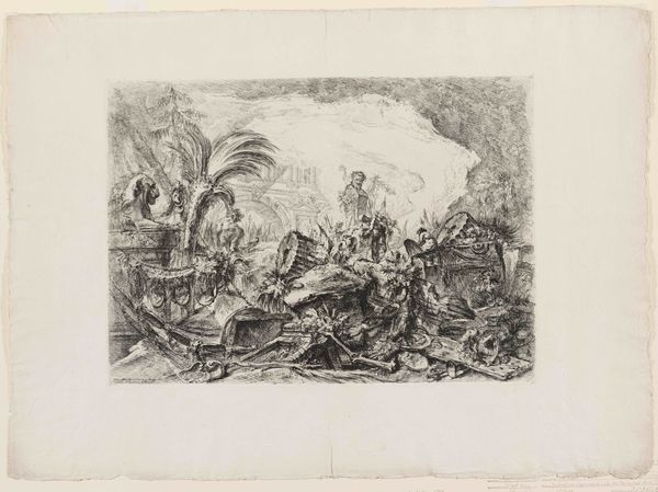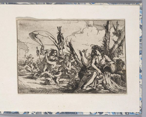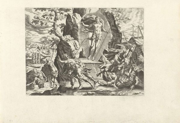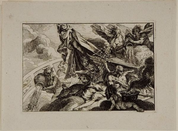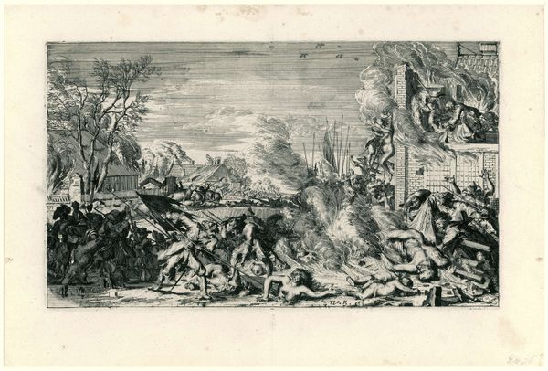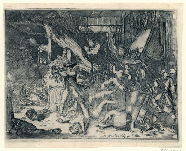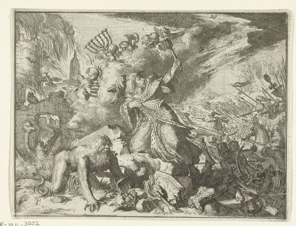 Editor: This is "Oorlog en tirannie teisteren Nederland," or "War and Tyranny Devastating the Netherlands," a 1674 etching by Romeyn de Hooghe, at the Rijksmuseum. It's… intense. The sheer chaos is overwhelming, all that fire and struggling bodies. What exactly am I looking at here? Curator: You’re looking at a carefully constructed political statement, reflecting the anxieties of a nation under pressure. De Hooghe uses allegory to comment on the Franco-Dutch War. Look at the central figure riding the lion – does it remind you of anything? Editor: It looks like… Louis XIV? But more like a god of war? Curator: Precisely! By depicting the French king in this way, De Hooghe isn't just showing a military conflict, but rather indicting Louis XIV's hubris. Consider the perspective of ordinary Dutch citizens at the time, constantly facing invasion. What symbols speak to the impact on their lives? Editor: The fallen people, the burning towns in the background... it’s less about glorious battle and more about suffering. The etching is communicating the very real social disruption. Curator: Exactly. And think about the choice of etching – a medium accessible to a wide audience. De Hooghe is deliberately disseminating a critical perspective. What kind of impact could images like these have in shaping public opinion and resistance during a war? Editor: So, this isn’t just a historical record. It’s a call to action. It humanizes the victims of war and also serves as political propaganda. I see that the figures and staging serve a precise purpose beyond being aesthetically beautiful. It’s interesting how De Hooghe situates this event within a broader commentary on power and accountability. Curator: Indeed, viewing this image invites us to question who benefits and who suffers during war and oppression, even today.