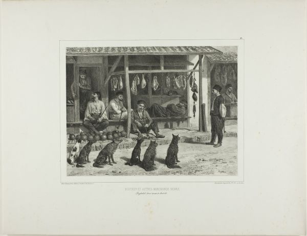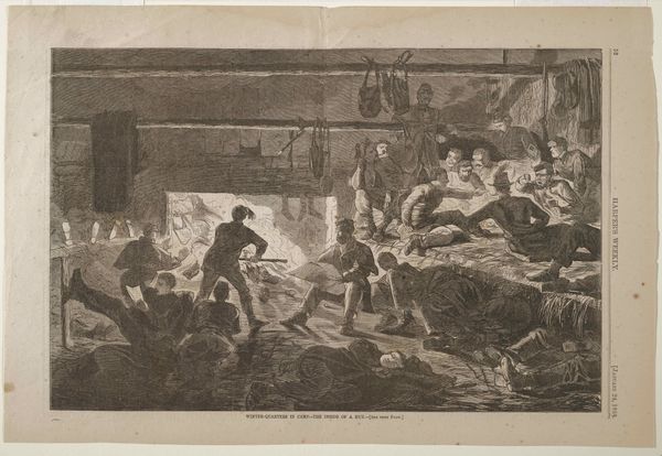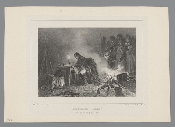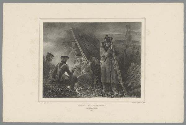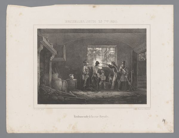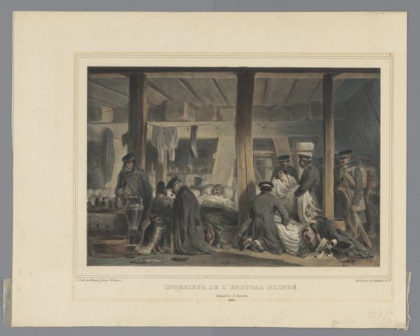 Editor: This is Auguste Raffet’s “Binnenzijde van het ingegraven veldhospitaal van de Citadel van Antwerpen, 1832,” created in 1833. It's a print housed at the Rijksmuseum, and what strikes me first is the almost unnerving calm depicted within what I assume to be a chaotic war environment. How do you interpret this work? Curator: Ah, yes, Raffet. He captures the quiet horror so well, doesn’t he? Look at the way the light filters—or, rather, struggles to filter—into this subterranean space. The scene becomes almost…claustrophobic, doesn't it? You feel like you're breathing the same damp air as those wounded soldiers. Have you ever considered how an artist's choice of perspective, from almost within the scene, affects your own experience? Editor: I see what you mean, it does draw you in. The figures seem caught between worlds, tending to each other in the dim light. But what about the implied story here, beyond just a field hospital? Curator: Well, consider the date, 1832. Belgium was fighting for its independence. Raffet, though French, captures this poignant moment. The makeshift hospital becomes a stage where ordinary men grapple with extraordinary circumstances. Do you think the seeming composure hints at something deeper, like resignation or perhaps even resilience? Editor: I hadn't thought about resignation, but that makes sense, it isn’t all heroic. Curator: Exactly! It isn't glorifying war. Rather, it's a quiet meditation on suffering and humanity amidst conflict. Sometimes the most powerful art resides not in grand pronouncements, but in subtle, haunting details. Editor: I’ll never see a hospital scene quite the same way again. Thanks for pointing that out. Curator: My pleasure! It is nice to let an old print awaken us again.