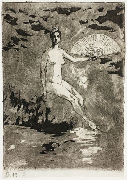 Editor: So, this is Theodore Roussel’s "Summer (Color Version)," made sometime between 1890 and 1900. It's an etching and drawing printed on paper, and it's got this very dreamy, almost melancholic feel. A seated nude holds a fan, set against this really dark background. What do you see in this piece? Curator: I see a fascinating interplay of tradition and modernity. The figure is reminiscent of classical nudes, yet the impressionistic technique, that almost dreamlike atmosphere, imbues it with a very modern sensibility. The fan is interesting, don’t you think? It’s not merely an accessory. Editor: Absolutely! I thought the fan, especially the way it's rendered with those bright red markings against the dark background, was striking. It looks almost like the marks could be flames. Is it supposed to be suggestive of something? Curator: Perhaps, or maybe something else. A fan, particularly in that era, carried a whole language of courtship, of coded messages. The depicted fan adds another layer: does it represent attempts at disguise, secrets and the unsaid during the transition of eras? Do you think this may add another layer of intrigue? Editor: That's a perspective I hadn't considered, so interesting! Now I feel I should study more about symbolism. It definitely encourages further reflection on societal expectations and personal expression at that time. Curator: Precisely! And the artist’s exploration of both intimacy and the gaze is equally intriguing, and, with these added perspectives in mind, will give you so much to think about! Editor: This was insightful; thanks so much!