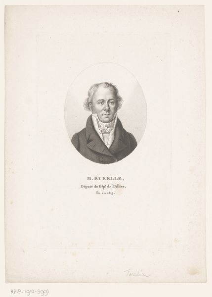 Curator: Looking at this portrait, I’m struck by its severe, almost stoic quality. Editor: Indeed. This is "Portret van Jean-Louis Admyrauld," an engraving done by Ambroise Tardieu between 1820 and 1821. What you are sensing comes from its Neoclassical style. Note the emphasis on clean lines and balanced composition within that oval frame. Curator: It feels very removed, almost cold. It’s the type of formal portraiture you’d expect of an early 19th-century deputy. It raises questions for me about printmaking as a medium for portraying political figures. Editor: See how Tardieu utilizes the technique of engraving. The fine lines creating gradients give it this wonderful texture and luminosity. There is the material process, transforming metal and paper to an image, which inherently introduces degrees of control. This suggests ideas of disseminating ideals of political leaders. Curator: It speaks to the rise of print culture at the time, democratizing images, albeit in a controlled manner, through the technology of the press. Think about the labor involved in creating each of these engravings, potentially disseminated widely. Who was able to acquire and circulate these prints and how were such images consumed and engaged? Editor: Certainly, mass reproduction implies a visual flattening. Do you feel the portrait itself achieves anything aesthetically through its formal elements alone, divorced from its social functions? The shading of his features seems to indicate the dignity of his figure, the way the face stands in relation to the coat—those relations signify character through line. Curator: The meticulous technique flattens emotion into the image. I think, inevitably, we see not just Admyrauld, but how printmaking was becoming a critical element in solidifying and marketing figures within political society. What appears austere reflects deliberate, labor-intensive practices which affected broader ideas of governance. Editor: I appreciate your points on its material and social ramifications. The work does lead you down this historical avenue regarding print culture. I still, nonetheless, believe one can grasp aspects like line work here that transcend beyond those readings in relation to politics. Curator: And perhaps in acknowledging both its aesthetic finesse alongside its historical contexts, we’re richer in our interpretation of Tardieu’s piece. Editor: A compelling intersection, truly.