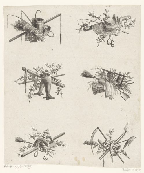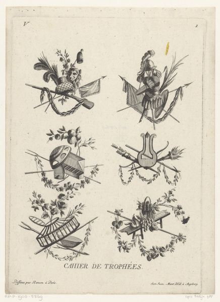 This print, titled "Trophies with attributes pertaining to architecture, sculpture and painting" was created by an anonymous artist. This piece offers insight into the cultural values of its time, where architecture, sculpture, and painting were celebrated as the pinnacles of artistic achievement. Each trophy is a carefully arranged composition of tools and symbols associated with these disciplines, bound together by garlands of leaves and flowers. Think about how these objects – the instruments of creation – are transformed into symbols of success and prestige. The trophies, however, also speak to the hierarchies inherent in the art world, and invite us to consider which forms of creative labor were valued and which were not. How might the absence of other artistic practices—like textile work or ceramics—reflect the social and gendered norms of the time? What does it mean to create images of victory?
