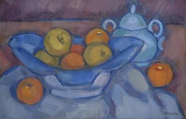 Curator: Here we have Kmetty János's "Still Life with Apples and Jug," an oil painting from 1930. Editor: My first impression is a sense of quietude. The cool blues and subdued lighting create a very still atmosphere, and yet, the shapes themselves have a playful, almost whimsical quality. Curator: Absolutely. János’s employment of colour is especially notable; there’s a Fauvist sensibility present in the way that the composition uses expressive, non-naturalistic colour choices to convey spatial depth and create a sense of formal dynamism. Notice how colour is the structure. Editor: I see what you mean. The fruit bowl brimming with apples and the jug aren’t just objects; they are vessels of meaning. Jugs have held symbolic value as emblems of purification and containment for centuries, representing ideas from emotional control to the provision of life’s necessities. The apples, meanwhile, possess associations of knowledge, temptation, and vitality. This arrangement almost becomes a miniature drama. Curator: Indeed. And think about the positioning of these objects. The arrangement feels less about capturing a moment in time, but rather about creating a study of pure form and structure using geometric components within the artist’s picture plane. It flattens conventional perspective. The relationship between foreground and background almost vanishes into pure visual stimulus. Editor: That makes me think about domestic space. Despite this artful refiguring of visual representation, this painting gives the impression of home—that here, in the midst of our daily routines, deeper significances simmer beneath the surface. Curator: Ultimately, I think this still life manages to create harmony between the pictorial architecture of planes and an appreciation of ordinary life. Editor: It is true that by decoding such an image we can have access into multiple strata of shared history. This opens us up to re-examine commonplace things with newfound sensitivity.