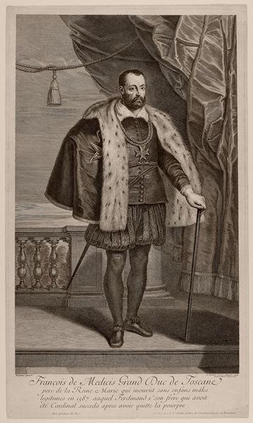 Editor: This is Daniël Mijtens’ portrait of *Charles I, King of England*, painted in 1629 and housed at the Metropolitan Museum of Art. The patterning in his suit immediately grabs you! It’s very intricate, almost distracting from his face, and alongside the crown and staff, speaks volumes about wealth and status. What historical context informs this painting? Curator: Well, this portrait needs to be understood as more than just an image of the King. Consider the setting: the imposing architecture, the royal regalia, the very deliberate pose. Mijtens is carefully constructing an image of power. Charles I, at this point, was actively cultivating an image of divine right to rule amidst growing tensions with Parliament. How does that awareness of political climate impact what you see? Editor: That makes so much sense. Knowing that there was this struggle makes the painting feel like propaganda almost? The King using art to project unwavering authority when he knew things were shaky. Curator: Exactly! And think about who this portrait was *for*. Was it for the general public? Parliament? Other monarchs? These kinds of commissions always have an intended audience, and the choices made by both the artist and the sitter are strategic, designed to elicit specific reactions, either reverence, respect, or fear. Editor: It is fascinating how much is communicated beyond just physical appearance! Understanding the politics changes everything. Now I wonder about Mijtens' own position. Was he simply fulfilling a commission, or was he also invested in bolstering the King's image? Curator: An excellent question! His position as court painter undoubtedly influenced his work. Reflecting on how institutions shape artistic production certainly opens new avenues for understanding this painting. Editor: Thanks, I’ll definitely look into the power dynamics more when approaching art. Curator: Indeed, viewing art as embedded in socio-political structures offers deeper insights. A powerful tool!