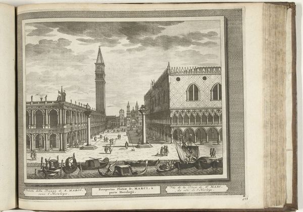 Curator: Looking at "San Marcoplein te Venetië," possibly from between 1675 and 1717, I’m immediately drawn into the print’s depiction of Venice’s political and social stage. What are your initial thoughts on it? Editor: There's a peculiar blend of calmness and implied activity, isn't there? The almost pastel palette creates this dreamlike quality, even with the square bustling with figures. I wonder what visual motifs stand out? Curator: It’s all about the symbols of power here, both civic and religious. Notice the columns topped with the Lion of Saint Mark and a religious figure, flanking the Doge's Palace. Venice's unique governance, that blend of merchantile prowess and Doge rule, is visibly present. The piece places the viewer within a very particular worldview. Editor: Absolutely! And speaking of symbols, consider the recurrent gondolas. More than just transportation, they're almost totemic of Venetian identity. They subtly reiterate Venice’s connection to the water, which is intrinsic to its cultural memory. What purpose might these figures have served in the city at this time? Curator: That is where the question of context becomes pertinent, especially given the artwork is ascribed to Pieter Schenk, as an engraver and printmaker the distribution and social reception of images would be essential to their intended meaning, their value was found not only in art appreciation but information spreading. We see the beginnings of mass media and their influence. Editor: Schenk also includes many individual characters in the square and around the waterways. There appears to be life, transactions, exchanges happening. This almost invites viewers of the work to superimpose their image into the world. What sort of narrative are you encountering as a modern viewer? Curator: It offers a stylized, curated perspective, for sure, but with glimpses of relatable everyday activity. It really underscores how the powerful families wanted to present Venice to both its own citizens and foreign dignitaries. This type of representation cements the ruling class image. Editor: It strikes me that we're really looking at a convergence of idealized imagery and emergent social documentation, all interwoven through visual language. This approach makes me reconsider how even these ostensibly objective landscapes inherently shaped or manipulated the perceived reality. Curator: Precisely. By examining this, the etching, engraving and watercolor as more than pretty landscape work, it allows us to analyze 17th-century modes of power. Editor: And for me, I take away a greater appreciation of visual symbols’ continuing potency. They can quietly mould perceptions over centuries, carrying layers of cultural weight we must actively decipher.