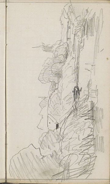 "Brug van boomstammen over een rotsachtige beek" or "Bridge of tree trunks over a rocky stream" is a pencil drawing by Johannes Tavenraat. Tavenraat, who lived from 1809 to 1881, was working during a time of great social and political change in the Netherlands, including the rise of nationalism and industrialization. This landscape embodies the romantic sensibilities of the 19th century. It is a moment of quiet contemplation and an appreciation for the natural world. But consider, what does it mean to create an image of untouched nature during a time of increasing urbanization and environmental change? It can be viewed as a form of escapism. The bridge itself is an interesting symbol, evoking connection, transition, and the crossing of divides. However, this one looks fragile and precarious. Perhaps Tavenraat is suggesting the tenuous nature of humanity's relationship with the environment. There is both beauty and precarity in this vision, a tension between the enduring strength of nature and the vulnerability of human intervention.