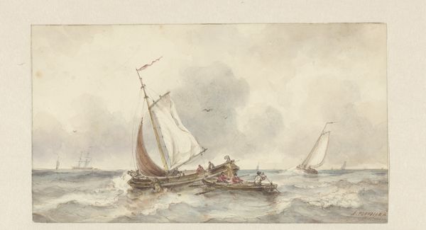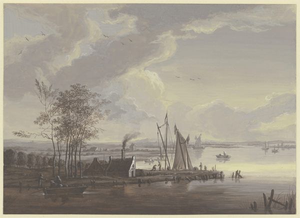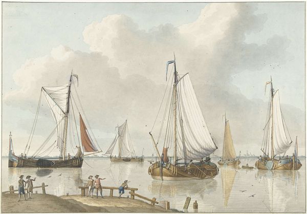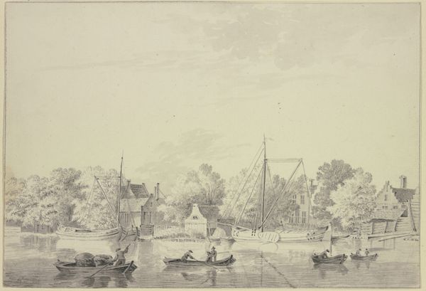 Editor: This is a watercolour and ink drawing by Nicolaas Wicart, titled "Two Ships Sailing on a Very Wide Stream, a Church on the Bank Among Trees." It feels serene, almost dreamlike, with the soft washes of color. I'm curious, looking at the details of the ships' construction, what's your perspective on this work? Curator: The materiality of this piece interests me most. The combination of ink and watercolour, particularly on paper, speaks volumes about artistic production at the time. Watercolors weren't necessarily considered "high art," more aligned with sketching or preliminary work. Look at the delicate underpainting, too. Editor: So you're saying the materials themselves challenge some established ideas? Curator: Precisely. And it prompts us to consider the social context: Who was making art like this? For whom? Was this intended for public display, or more personal consumption? What kind of labor went into the construction of these boats? Editor: That’s interesting; it’s not just the final image, but the materials and the labor behind it that tell a story. I guess I hadn’t considered how the perceived "value" of a material could affect the art itself. Curator: It certainly does! It redefines our understanding of value. By focusing on the means of production, we can unpack social hierarchies embedded within the art world itself. Editor: Thanks, I see it now! I’ll definitely pay more attention to how and why an artist chooses certain materials. It adds a whole new layer of understanding. Curator: Absolutely. The devil, as they say, is in the details... especially the material ones!