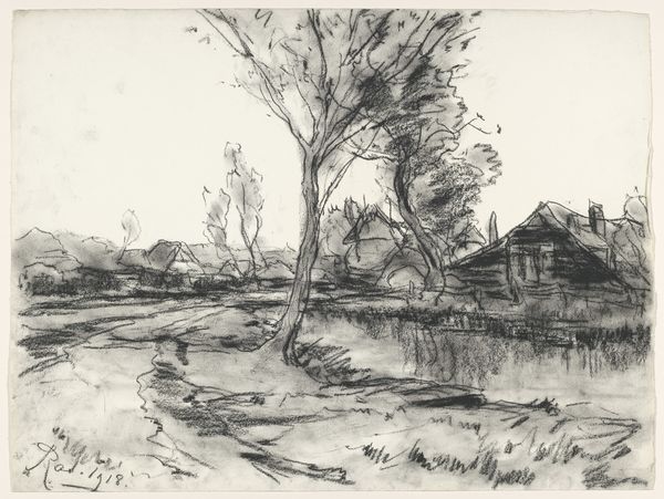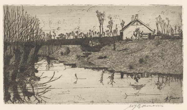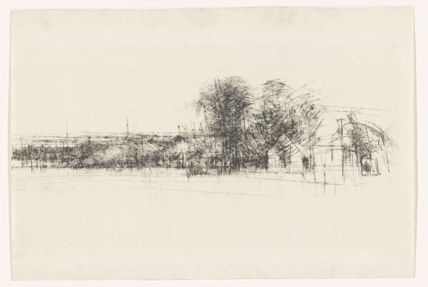 Editor: This print, "Dorp in vogelvluchtperspectief," which translates to "Village in Bird's Eye Perspective," is an etching by Kees Stoop, created sometime between 1944 and 1990, now held in the Rijksmuseum. It's predominantly a monochrome image using dense hatched lines, giving it a somewhat bleak, wintery feel, a landscape seemingly devoid of activity. What stands out to you about the social or cultural context in this etching? Curator: What strikes me is the representation of the landscape. Its social role is crucial; landscapes, throughout history, are rarely neutral. They are often tied to national identity, land ownership, and the power structures inherent in those systems. Consider the Dutch Golden Age landscape painting tradition. How might this later etching, while distinct in style, still engage with those established conventions? Editor: I suppose the very fact it's a bird's-eye view suggests a kind of ownership or survey of the land. A detached, perhaps even powerful perspective. Is the relative desolation then perhaps a commentary on post-war Dutch society? Curator: That's an insightful reading. The desolation could indeed be interpreted in multiple ways. Do you think it simply depicts a sparse landscape, or could the sparseness symbolize something beyond the visual, possibly alluding to societal conditions? Are there any details within the landscape that suggest human activity or its lack thereof? Editor: Well, I see a couple of small houses and what appear to be very roughly drawn paths, but everything looks abandoned or, at best, unattended. There aren't any people depicted at all. Curator: Precisely. And what kind of statement do you think is being made by presenting an environment seemingly devoid of activity and the signs of social engagement, and moreover displaying it at the Rijksmuseum? It certainly generates a strong message to the Dutch citizens about their landscape and what that means after war. Editor: I see what you mean. I initially saw bleakness but perhaps it’s a prompt for rebuilding. Thank you. Curator: And thank you; you’ve illuminated the work in a way I hadn't previously considered. This really exemplifies how looking at the historical moment is never one thing.