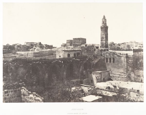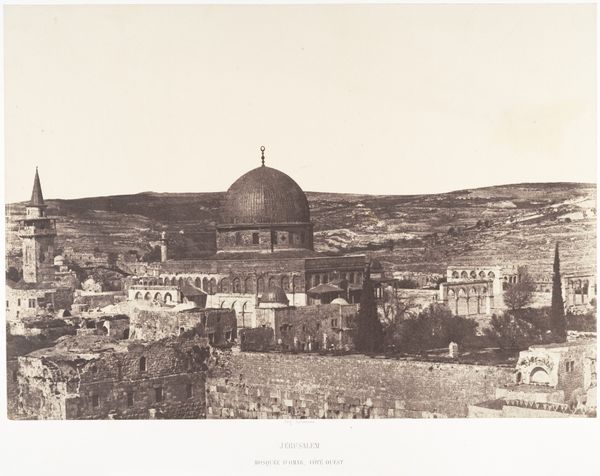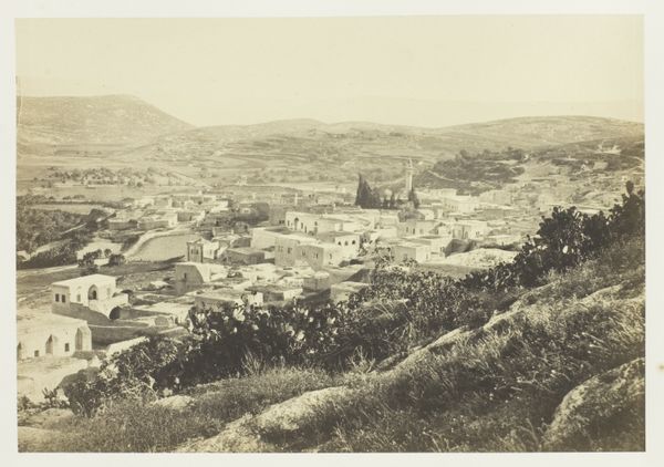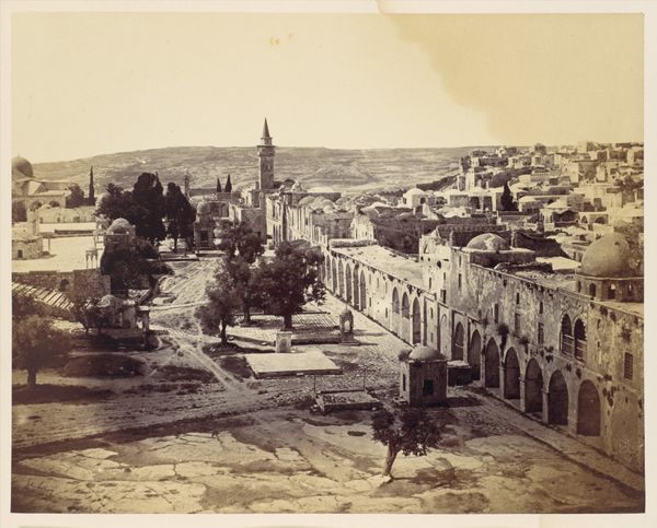 Curator: Here we have Francis Frith’s 1857 daguerreotype, “The New English Church from the Tower of Hippicus, Jerusalem.” Editor: My initial reaction is that it's incredibly still. The whole city, captured in a time capsule, radiating permanence with its sturdy construction of masonry. Curator: The material choices contribute greatly to that impression. The very process of the daguerreotype, with its mirrored surface and metallic base, inherently conveys a sense of solidity and lasting presence. Editor: Right, but that feeling clashes with the colonial undertones humming beneath the surface. Look at the title. “The *New* English Church.” That immediately signals a specific agenda and the assertion of power dynamics in Jerusalem at this time. Curator: Absolutely. Frith's meticulous method involved on-site preparation and development under difficult conditions. Imagine the labour, the chemicals needed for the daguerreotype process, all imported and applied in this environment. What about the water source? The silver and mercury used in the daguerreotype itself, consider how they are used here. Editor: It also makes me consider the very act of documenting this landscape and superimposing European architectural norms. The construction of the New English Church in itself must have generated substantial labor and resource extraction. Did Frith, in his creation of this image, address the colonial dynamics present, or did he operate from a position of privilege inherent within the colonial framework? Curator: It is definitely worth mentioning that these photos became essential components for promoting trade, colonialism, and also archaeological ventures throughout the Middle East. The visual language and technical process became tools for managing perception and influence on a massive scale. Editor: Exactly. By considering the circumstances surrounding Frith's work and the subsequent dissemination of his images, it becomes clearer how photography became intricately intertwined with complex social dynamics and ideological agendas. This church and others would certainly play an important role. Curator: Examining photography this way really brings to light how process is just as important as what it captures, the relationship between means and messages so closely intertwined. Editor: And thinking through the role of the artwork as an artifact—embedded in layers of historical processes, whether intended or not—opens a space to engage with uncomfortable discussions of power, representation, and agency.