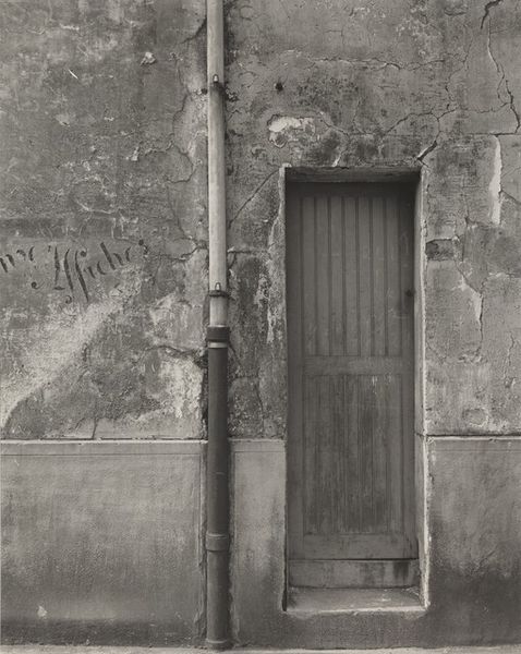 Curator: Jindrich Styrsky's gelatin silver print, simply called "Untitled," presents a rather somber, almost spectral scene. Editor: It certainly does. The stark contrast and grainy texture immediately convey a feeling of decay and isolation. Curator: Note the meticulous composition, though. The placement of the headstone, the small table—they create a visual rhythm, directing our gaze across the frame. Editor: And the German inscription on the stone, "Ruhestätte der Familie Brousil," suggests this is a family burial site, hinting at specific cultural and historical contexts related to death and remembrance. Curator: The wall behind, with its peeling paint and darkened patches, functions almost as an abstract expressionist painting within the photograph. Editor: Yes, that backdrop contributes to the overarching narrative, underscoring the passage of time and the impact of history. Curator: A fascinating interplay between form and content. Editor: Indeed, Styrsky invites us to contemplate both the visual elements and the socio-cultural implications embedded within the image.