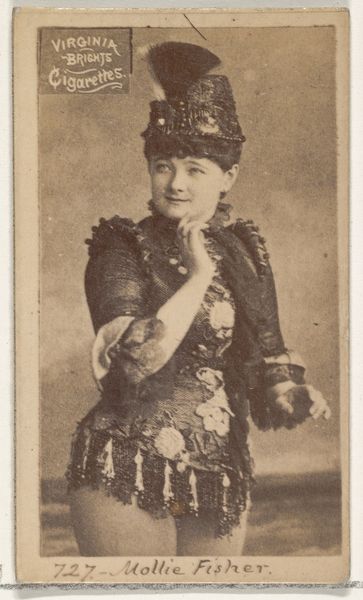 Curator: This is Card 771, depicting Annie Summerfield, and it comes to us from Allen & Ginter’s "Actors and Actresses" series. These cards were produced between 1885 and 1891 as trade cards for Virginia Brights Cigarettes. Editor: The overall sepia tone and the formal pose give it a very vintage feel, obviously. But I am particularly drawn to her attire. The elaborate feather in her cap, the chain with floral medallions, it suggests a regal or theatrical character, even fantastical. Curator: Indeed. These cards provided a valuable form of marketing for consumer goods during a period when the availability of printed media and color illustration was fairly limited. In this case, Allen & Ginter aimed to add some value by associating their brand of cigarettes with contemporary public figures. Summerfield, however, seems lost to history beyond this specific portrayal. Editor: The theatrical association rings true to me; she’s posed as a kind of stage queen. What do you make of the neutral backdrop contrasting the meticulously crafted look and the tiny brand placement? Does it undermine its aura somehow? Curator: Quite the contrary. It suggests to the consumers of the time the social and political reach that smoking afforded them. This connection could also imply to those with different class identities, whether they identified as aspirational or historically elite, to purchase such materials. It gives us an example of the subtle, class based forms of advertisement of the era. Editor: That makes a lot of sense. I'd never considered it in that light. The visual language speaks directly to aspiration, doesn't it? It shows the cultural power projected through popular personas during the time period. Curator: Exactly. Understanding these cards necessitates diving into both the social conditions of production and the evolving iconography around public image, especially for actresses at the time. Editor: It’s striking how a small, everyday object can reveal so much about a bygone era’s values and desires. Curator: Absolutely. Each little card provides an invitation to consider how fame, aspiration, and commerce intersected at a particular historical moment.