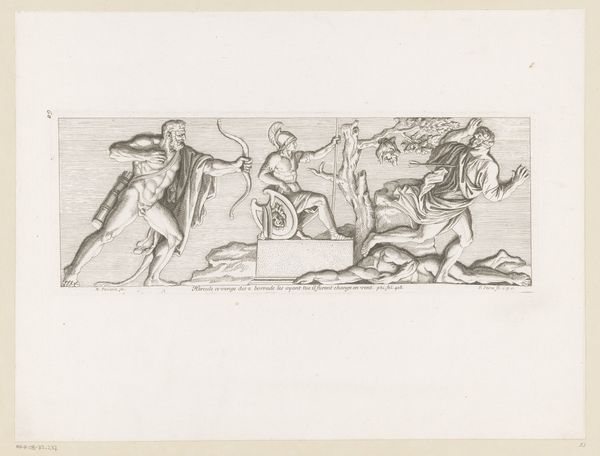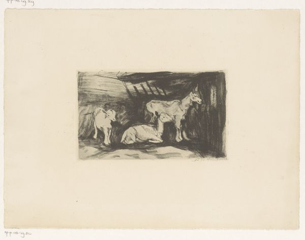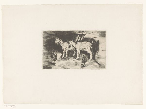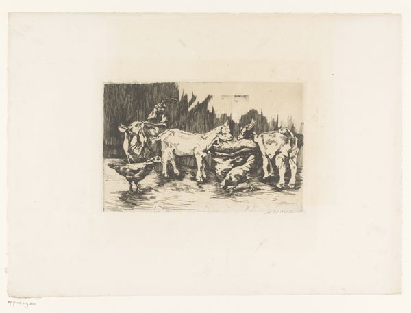 Curator: Editor: This is "Two Goats and Five Chickens" by Adolf Eduard Herstein, created sometime between 1879 and 1932. It’s an etching on paper currently held at the Rijksmuseum. I’m immediately struck by how grounded and real it feels. It's not idealized in any way. What draws your eye? Curator: What intrigues me is how the work implicates the very means of its creation into its meaning. Look at the etched lines – they’re not just depicting the animals, but showcasing the labor of image production itself. The texture of the paper, the depth of the ink… how do these elements impact your understanding of the scene? Editor: That’s a really interesting point. I was focused on the animals and their environment, but I see what you mean. The etching process, with its repetitive labor, mirrors the repetitive, perhaps mundane, existence of these farm animals. The medium becomes part of the message? Curator: Precisely! Consider too, the likely audience and purpose of a printed work like this. Was it intended for mass consumption, as decoration, or for a more elite collector? What does its circulation tell us about art markets and value judgments at that time? This blurring of art and commodity complicates simple ideas of high and low art. Do you think Herstein consciously engaged with those ideas? Editor: That’s something I hadn’t thought about – the work’s role as a commodity. I’d assumed it was simply about capturing a slice of life. Maybe he was commenting on the changing role of art itself in society. Now I am also starting to think about who acquired and collected similar pieces back then. Curator: Exactly! By examining the materials, techniques, and potential social context, we start to see the artwork not just as a picture, but as a product deeply intertwined with economic and social realities. Editor: This completely shifted my perspective. It is indeed interesting how focusing on material aspects changes our comprehension of the work's intent and context! Thank you. Curator: My pleasure! Remember to look beyond the surface; the materiality of art tells important stories.