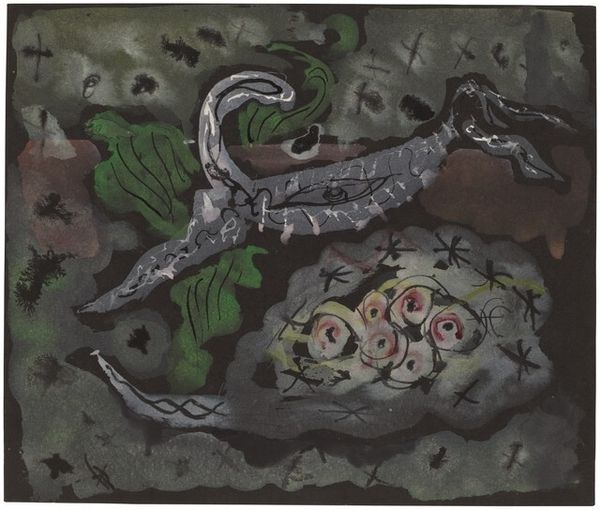 Curator: This is "Llanthony Abbey" by John Craxton. The image captures the romantic ruins in a surreal landscape. What do you make of it? Editor: It’s quite striking. The massive tree roots dominating the scene give a sense of nature reclaiming history. There’s a palpable tension between decay and growth. Curator: The Abbey resonates with ideas of religious authority diminished by time and the rise of a new social order. The natural world encroaching acts as a metaphor for political and social upheaval. Editor: I see the formal contrast between the geometric architecture and the organic, almost visceral, lines of the tree. It pulls the eye in different directions, creating a dynamic composition. Curator: Indeed. Craxton made this drawing in the 1940s, placing it amid wartime anxieties and reflecting a broader societal shift. The romantic ruin becomes a symbol of loss and change. Editor: I'm drawn to how the monochrome palette emphasizes texture. The wood grain, stone, and leaves feel so tactile despite the lack of color. Curator: It's a potent image that captures a moment of historical and cultural transition, visualized through its striking contrasts and symbolic weight. Editor: It gives us much to contemplate about nature, time, and art.