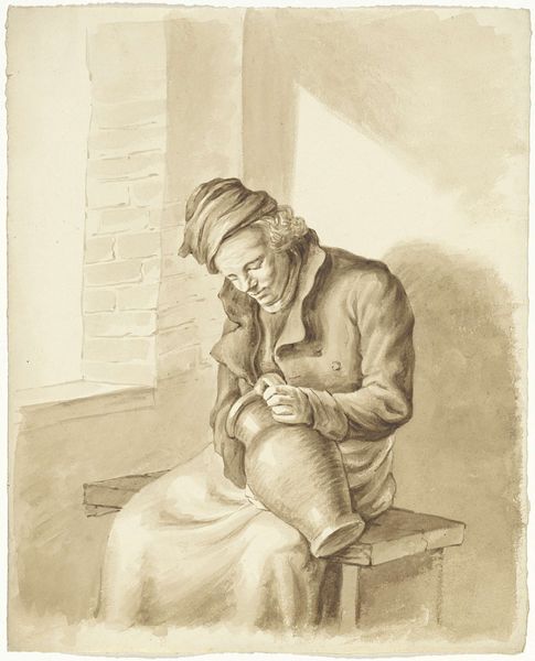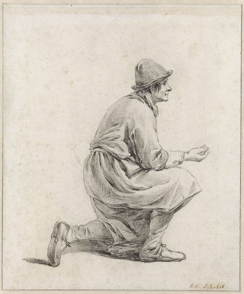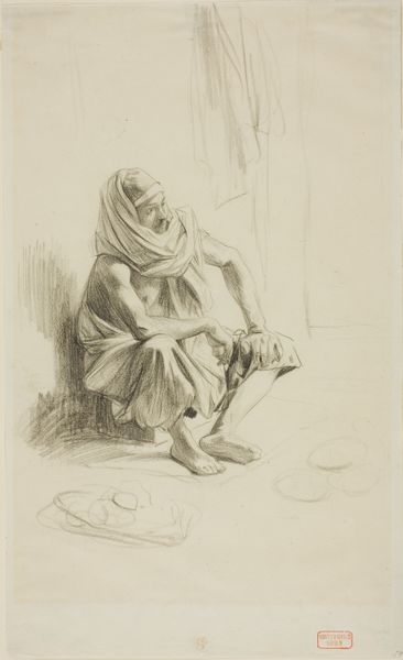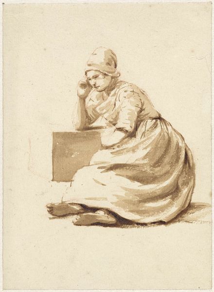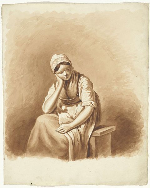 Editor: We're looking at a drawing titled "Studie van een zittende vrouw met de arm onder het hoofd"—"Study of a Seated Woman with Her Arm Under Her Head,"—probably from 1814, by Abraham Johannes Ruytenschildt. It's a charcoal drawing, and I’m immediately struck by the moodiness, this sense of quiet contemplation it evokes. What do you see in this piece? Curator: Ah, yes. A window into a soul, wouldn't you say? The way Ruytenschildt uses that earthy charcoal to create soft shadows...it almost feels like he's trying to capture a fleeting thought. I'm curious about the way she's positioned - almost slouched. Do you think there's an element of vulnerability there? The Romantic era often idealized common people, yet this feels like something deeper, more intimate. Not posed or glamorous, but genuinely... human. Editor: I can see that. I was so focused on the emotion in her face, I hadn’t really considered her posture. Do you think that the limited palette adds to the intensity? Curator: Absolutely! Imagine her rendered in vibrant color… wouldn't it feel completely different? The monochromatic approach encourages us to look at the nuances of light and shadow, to feel the weight of her thoughts. I imagine Ruytenschildt working quickly, trying to capture the very essence of her spirit before it vanished. Almost like plucking a melody from the air! What about the fact that it is a study? Does it feel unfinished to you? Editor: I think its unfinished feel really suits it! Curator: I agree completely. To be honest, for me this has captured a certain essence of the beauty of the mundane. I'm ready to go find a cozy corner and contemplate my own navel for a while. Editor: I think I'll be making more trips to the drawing section from now on! Thanks!