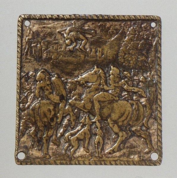 Curator: Today we're looking at a bronze relief sculpture titled "Horatius Cocles Defending the Bridge," created by Master IO.F.F. around the 15th century during the Italian Renaissance. Editor: It’s remarkable how much energy the artist manages to convey in such a small space! The way the figures are packed together, the exaggerated gestures—it creates a sense of urgent chaos. It almost feels like a mosh pit. Curator: Absolutely. It’s drawing on a specific narrative from Roman history. Horatius Cocles was a Roman officer who single-handedly defended the Pons Sublicius against the Etruscan army, allowing the Romans to destroy the bridge and prevent the enemy from crossing the Tiber. Think about the socio-political implications: valorizing patriotic sacrifice during a period of intense civic pride and competition among Italian city-states. Editor: So it’s less about the specific historical accuracy, and more about using the past to construct an idealized image of masculine virtue and the defense of homeland? Are we looking at a mythologized understanding of history that prioritizes an exclusively white male interpretation of heroism? I wonder about how this image was consumed: did it incite civic responsibility, or reinforce societal power structures? Curator: That's a crucial point. We should also acknowledge that art production during the Renaissance was intrinsically connected to wealthy patronage, thus influencing the distribution and the narrative communicated through these sculptures. Wealth and political clout largely controlled artistic output. This piece likely served a propaganda purpose: reinforcing the ruling class agenda. Editor: This complicates any straightforward understanding of "heroism" the relief attempts to illustrate. Knowing the Roman empire's history of territorial conquest, class and racial suppression adds a critical layer through which to understand what this heroic display obscures. In other words, at what cost comes the glorification of one man at the expense of so many others? Curator: I think you're spot on in pointing out how that kind of perspective invites critical interrogation, because ultimately the circulation of artworks always reflects a political context, where power operates. Editor: Right! I will consider the Horatius Cocles narrative within its own social landscape moving forward. It encourages thinking beyond the visual, considering power, privilege, and social impact.