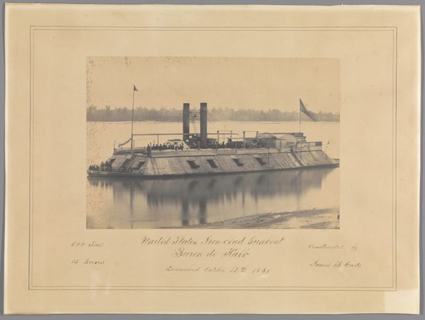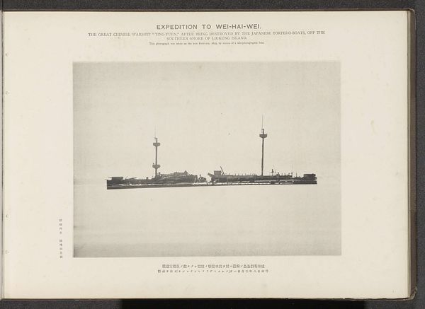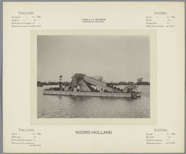 Editor: Here we have "Holland," a gelatin silver print likely created between 1900 and 1910 by Henricus Jacobus Tollens. It features a ship, photographed in a soft, almost dreamy style. It is somewhat difficult to make out some of the details because the tonality is quite soft. What strikes you most about this work? Curator: I observe a photograph demonstrating characteristics of Pictorialism. Note the soft focus, a deliberate manipulation to move photography closer to painting. See how the scene is rendered with atmospheric effect rather than sharp detail. Can you perceive how the ship, the focal subject, interacts with the water? Editor: It does seem to almost blend in, doesn't it? Like it’s emerging from the water. Is that typical of pictorialism? Curator: Indeed. Consider the composition itself: the placement of the ship within the frame. Its horizontal emphasis elongates the format of the picture, which interacts with the muted grayscale of the gelatin silver print. Editor: I'm noticing, also, how the text surrounding the image gives it this diagrammatic quality that contrasts the soft style of the picture. It seems more about data and measuring than the atmosphere, almost pulling it in different directions. Curator: The typographical layout operates as a structured frame, further containing the pictorial field of vision. It invites a reading of photography as both art and document. The interplay is not always comfortable but interesting, isn't it? Editor: Absolutely. I was focusing so much on the hazy effect that I overlooked that. It’s fascinating how close visual analysis can reveal so many different perspectives.