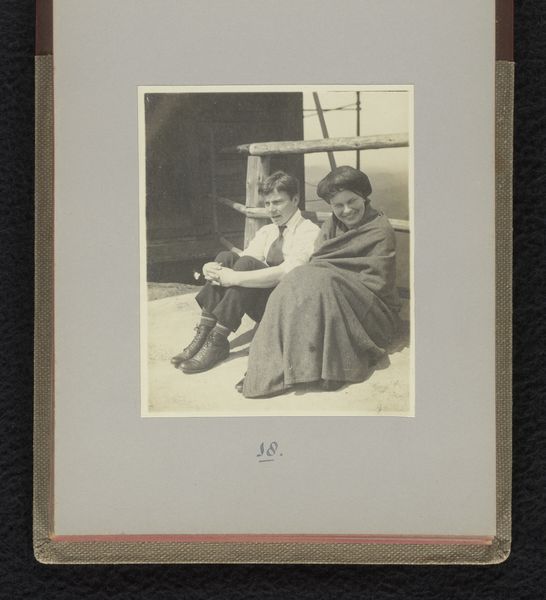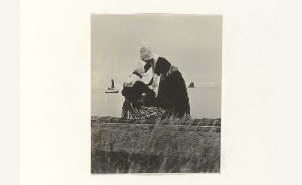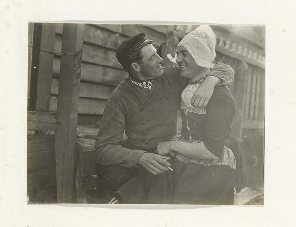 Curator: Welcome. Today we will consider this fascinating vintage photograph entitled "Twee mannen in klederdracht, onder wie één in vrouwenkleding", circa 1900-1910, attributed to G. Hidderley. Editor: This photo is striking; it feels playful and subversive, seeing these two figures posed so intimately. What do you see in this piece? Curator: Focusing on the composition, observe how Hidderley has framed the figures; they occupy most of the picture plane. The textures are palpable, aren’t they? From the rough fabric of the men's clothing to the delicate lace of the bonnet, each element contributes to the image's tactile quality. What strikes you about the interplay of light and shadow? Editor: I notice that the shadows seem to enhance the depth, highlighting the details in the costumes and adding a dramatic effect to what might have otherwise been a simple portrait. Curator: Precisely! Consider too, the repetition of shapes, the vertical lines of the fence contrast with the curves of the bonnet and the embrace of the figures, creating a visual rhythm. And the gaze they share: It holds considerable semiotic weight. Is there anything that perplexes you in this photo? Editor: The act of cross-dressing feels rich with social implications. To read it now versus the era it was taken poses interpretive questions. It also stands out to me that there are only two subjects and the focus they display to one another. Curator: It seems Hidderley prompts a discourse on how identity can be actively composed. Reflecting on this interplay of form and potential cultural meanings allows a more robust encounter with the image, wouldn’t you agree? Editor: Absolutely. Seeing it broken down like that provides an insightful view beyond just its face value. Curator: Indeed. Hopefully, this perspective helps others view art with heightened awareness.