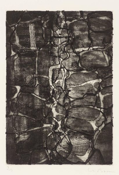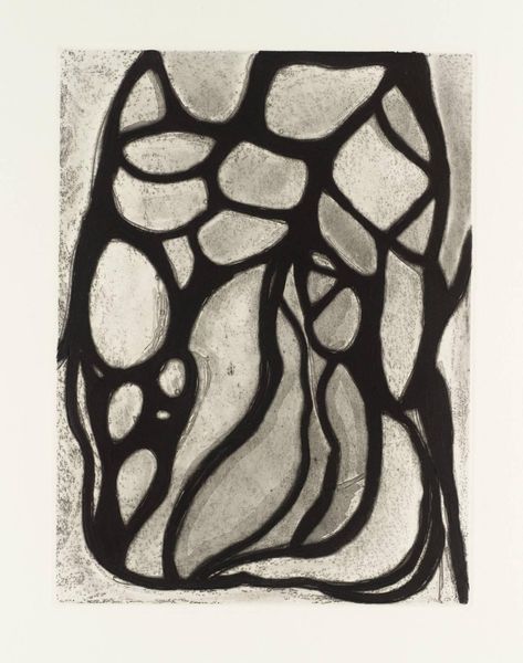 Editor: Here we have an untitled print by Christopher Le Brun, held at the Tate. The stark contrast and simple forms are quite striking. What can you tell me about this piece? Curator: Well, I'm interested in how this print challenges traditional hierarchies. The medium itself, a print, speaks to reproducibility and accessibility, differing from unique artworks. What materials were likely used? Editor: Based on the texture, probably etching or aquatint, some kind of metal plate and acid. Curator: Precisely. This brings the artist’s labor into focus. Consider how the process of acid etching on metal contrasts with, say, oil painting in its implications for labor and, ultimately, consumption. It's not just about the image, but the means of its creation. Editor: That's a perspective I hadn't considered. Thanks! Curator: My pleasure.
