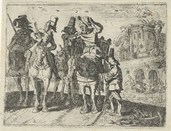 Curator: The energy in this print is striking—almost frantic. The frenzied lines of the engraving seem to mirror the chaos depicted within the scene itself. It's incredibly dark. Editor: This is “Hanging by the Thumbs (Modern Military Punishments),” a pen drawing, etching, and engraving by William Hogarth, likely created between 1720 and 1779. The work is currently held at the Metropolitan Museum of Art. It offers a stark glimpse into the disciplinary practices of the time, a military punishment displayed for the gathered troops. Curator: Oh, brutal. I’m immediately drawn to the central figure suspended—his agony almost palpable, despite the distance of centuries. Hogarth doesn’t hold back, does he? There's this terrible symmetry, this visual "dance" around a core of intense suffering. Editor: Indeed. Hogarth uses his art as a vehicle for social commentary. This piece specifically confronts the abuse of power within the military. We must consider the broader implications of the depicted cruelty, connecting it to systems of oppression that were, and in many ways remain, normalized. The image of the gathered men reminds us of complicity and sanctioned violence. Curator: There's a distance, though, between us and them. A sort of theatrical remove, maybe? It feels carefully staged. Look at those men on horseback to the right. There is an almost casual nature in their expressions, contrasting horrifically with the tortured man in the center. Does that strike you too? It reminds me a bit of the idea of performance, but who is the intended audience, and why? Editor: That is astute. It compels us to question what Hogarth sought to reveal about power and those who wield it with impunity. Are these not the scenes that construct statehood? And who are we, the observers, in this historical performance? It prompts dialogue about military culture, its impacts on individuals and society, and echoes throughout modern-day conversations around military ethics and the potential for abuse inherent within hierarchies of power. Curator: The image haunts me—both a reflection of history and an unsettling mirror to present-day abuses of power. It lingers in the mind, long after you've walked away from it. Editor: Absolutely, and this serves as an important reminder to critically examine such legacies in modern contexts. Art like this helps us engage in discussions about creating a more just and ethical future.