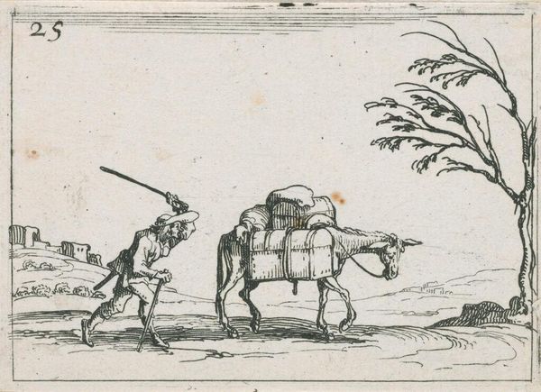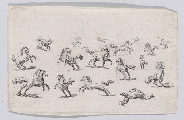 Editor: This is Jacques Callot’s "Horses Running Free." It's a small etching. It feels chaotic, but also elegant with all the prancing horses. What compositional elements stand out to you? Curator: The dynamism of the figures is compelling, isn't it? Consider the formal arrangement. Callot's use of line creates a sense of movement. Note how the varying weights of the etched lines define form and suggest depth, despite the limited tonal range. Editor: So it's all about the lines creating the feeling of freedom? Curator: Precisely. The lines are the architecture through which we interpret the subject. By analyzing the linear structure, we decode the artist's intention and the artwork’s meaning. Editor: That gives me a new appreciation for the detail in the lines. Thanks! Curator: My pleasure.