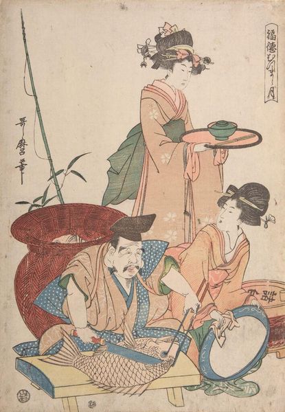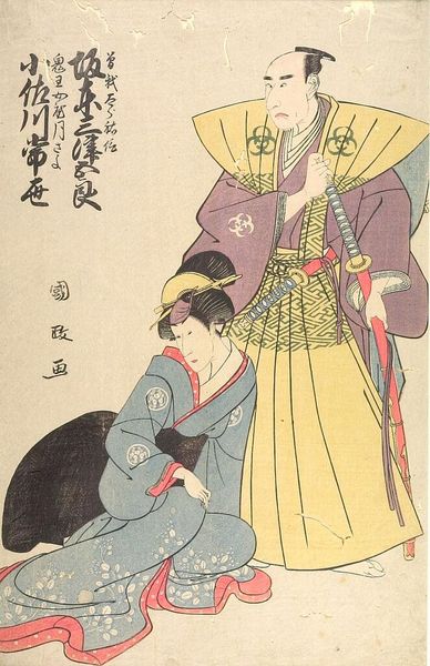 Curator: This woodblock print, "Two Figures in Rain" by Utagawa Kuniyoshi, depicts a man and woman caught in a downpour. The artist lived from 1797 to 1861, leaving behind a legacy that captures a pivotal era in Japanese history. Editor: My immediate impression is one of quiet resilience. They appear unbothered and calm despite the rain, as though nature holds no dominion over their spirits. Curator: Absolutely. Kuniyoshi’s treatment of gender is noteworthy here. The woman stands, seemingly offering protection to the seated man, disrupting traditional power dynamics. The parasols and garments they wear symbolize wealth, but also perhaps a degree of societal constraint. Editor: The image of rain itself carries significant weight in Japanese art and culture. It can represent cleansing, renewal, but also melancholy. Notice how it obscures the background, isolating our figures in this intimate moment of shared experience. Curator: I agree. And it brings into focus the idea of shared vulnerability, the way natural elements can level social hierarchies. Editor: Indeed. It's a compelling snapshot, filled with both cultural nuance and surprisingly modern sentiments about gender and class. Curator: It leaves us with a sense of the individual amid the societal, a theme that still resonates today.