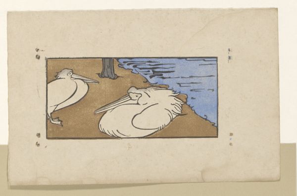 Curator: Oh, look, here’s “Two Pelicans at the Water’s Edge” by Reinier Willem Petrus de Vries. It's somewhere between 1884 and 1952, done with ink on paper, very minimal. Editor: It makes me feel… zen? Like those little scenes you find painted on porcelain. There’s this understated calm; all straight lines and curved bodies. Curator: Well, de Vries seemed deeply drawn to Orientalism, which explains a lot. He plays with flatness, right? Creates a shallow depth. It's less about naturalistic representation and more about conveying an essence. We are drawn into its graphic form. Editor: I can totally see the Orientalism showing up! It feels less about the nitty-gritty reality of the pelicans, and more about turning them into almost emblems, like characters in an old story. Notice how few lines he uses? And how strategic their placement is? It has a powerful quality. Curator: Absolutely. Semiotically, we see how the artist uses simplified forms. He draws on the conventions of Japanese prints – ukiyo-e—which favoured flat, graphic design and stylized depictions of nature. Think of the symbolism there. Birds near water always hint at purification or a kind of spiritual cleansing. It goes very deep. Editor: It’s kind of a double-whammy of calm, right? You've got the pelicans just chilling and existing near a body of water, then you also have the actual technique creating this Zen effect that has all these allusions to the symbolism you mentioned. It all folds in on itself. I would consider it a "two for one deal." Curator: And there’s also this sense of design that overtakes reality. What I mean by this, in this drawing, is this urge for abstraction which simplifies our reading into more stylized and purified signs of their animal reality. Editor: It makes me consider just how much the composition itself dictates its impact. I think de Vries tapped into something ancient—universal symbols with his ink. Curator: It does make you feel thoughtful, this small vignette from a long time ago! Editor: For me it conjures stories and legends, even!