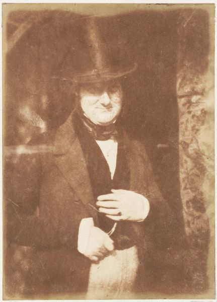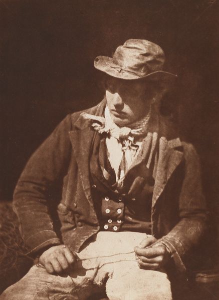 Curator: Here we have "Newhaven Fisherman," a gelatin silver print made between 1843 and 1847 by Hill and Adamson. It’s currently held at the Metropolitan Museum of Art. Editor: There’s such a profound stillness to it. The sepia tones lend an almost melancholic weight, and the subject's downcast gaze—it speaks volumes even without revealing his eyes. Curator: Indeed. What strikes me is the negotiation of class and representation occurring here. This portrait wasn't merely a neutral depiction but was constructed at a particular historical moment where photography served to solidify societal structures and roles. These fishing communities in Scotland faced tremendous socio-economic upheaval. Editor: Yes, and it also represents an engagement with pictorial conventions. Look at how the light models his form, directing your eye from the rumpled hat down the line of his jacket, creating a classical pyramidal composition, grounding the image. It brings a strong sense of balance. Curator: That romantic framing certainly impacts our understanding. It risks turning the fisherman into a picturesque figure, abstracted from the hardships inherent to his lived reality within this community during the social disruptions. Editor: I appreciate the soft gradations of tone made possible by the photographic technique. The texture of the fabric of his jacket, even the weathering on his face. It presents a type of realism that's far from sterile, an almost palpable quality. Curator: To appreciate this work fully, we need to recognize photography’s place within the broader context of colonial practices. Adamson and Hill chose this subject for a specific purpose, impacting how we interpret labor, identity, and authenticity even now. The image needs to be decoded and deconstructed so that we do not glorify historical inequities. Editor: But beyond that sociological aspect, what endures is the formal mastery; how the subtle tonal shifts give presence and form. Curator: Agreed. Ultimately, understanding the nuances enriches our experience of this complex image. Editor: For me, it's how Hill and Adamson balance that human presence within such a delicately constructed visual architecture that captivates.
