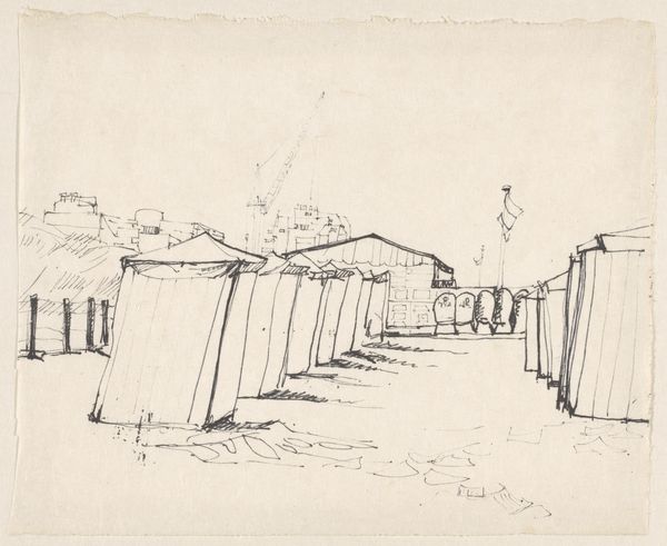 Curator: This delicate drawing by Hermann Glöckner, titled "Line of Houses in Golberode near Goppeln," presents a fascinating study in form. Editor: It feels raw, almost like a blueprint or the ghost of a village; the visible pencil strokes give a sense of immediacy. Curator: Indeed, the linear quality emphasizes the architecture, reducing the houses to their most basic geometric shapes. Note how the lines intersect and create planes. Editor: And how the texture comes alive with the layering of those lines, suggestive of the labor involved in building these structures, both the drawing and the houses themselves. Curator: Precisely, the abstraction allows us to see beyond the literal representation and consider the underlying structural principles at play. Editor: There’s a subtle tension between the precision of the architectural forms and the rough, unfinished quality of the drawing itself. It makes me think of the daily lives lived inside those constructed places. Curator: A compelling observation, shifting our perception of representation and reality. Editor: Ultimately, it’s a fascinating exploration of how places are imagined and made real.