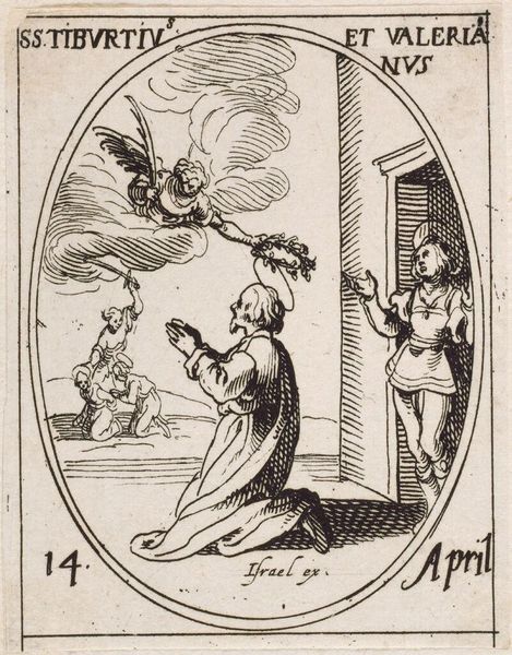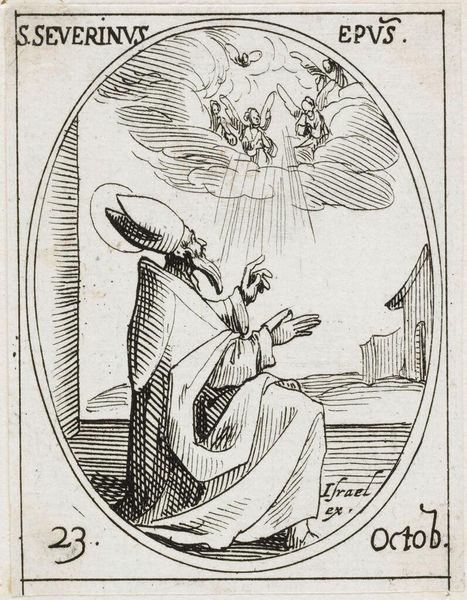 Editor: This engraving, "Saint John of Damascus" by Jacques Callot, is striking despite its small size. The stark contrast of the lines creates a dramatic effect. What do you notice about the composition? Curator: The formal arrangement is quite deliberate. Observe how Callot uses line to define space and form. The contrasting textures, from the saint's robes to the ethereal clouds, establish a dynamic visual rhythm. Editor: So, the lines aren't just representative; they contribute to the overall impact of the piece? Curator: Precisely. The density and direction of the lines create a sense of volume and depth. Notice how the lines converge to draw the eye towards the central figures, creating a focal point within the oval frame. Editor: That's a perspective I hadn't considered. It's like the lines are constructing the meaning. Curator: Indeed. The very materiality of the lines becomes a language in itself.