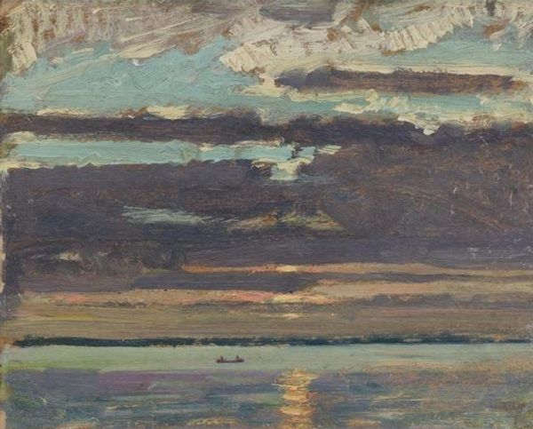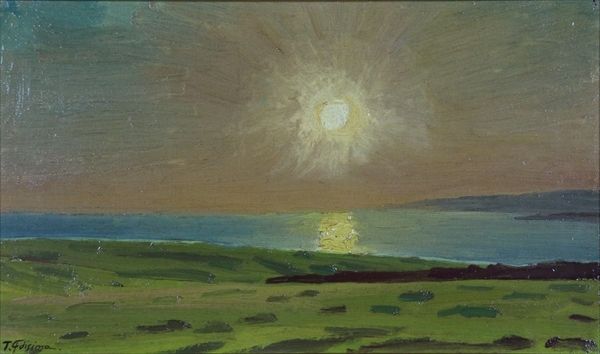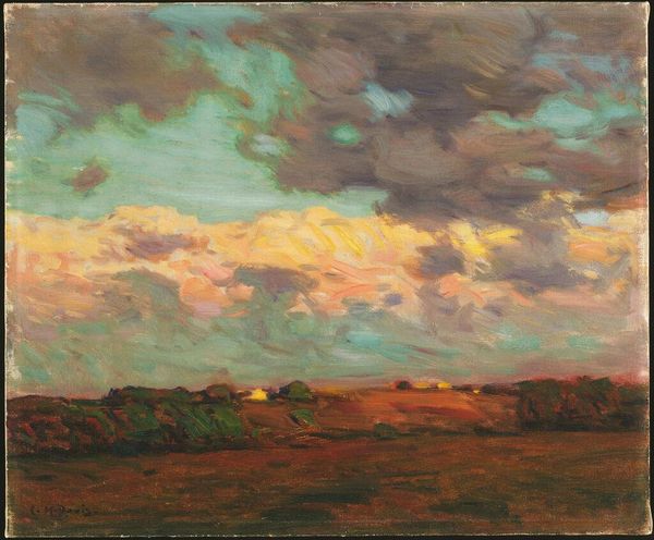 Editor: Here we have John Constable's "Summer Evening With Storm Clouds," an undated painting of what appears to be a landscape under a rather dramatic sky. It strikes me as a scene both beautiful and ominous, almost romantic. How do you interpret this work? Curator: I see a meditation on transient moments, rendered in the language of light and shadow. The sun, a glowing orb, fights against the encroaching darkness. Consider the cultural memory of light as knowledge and darkness as ignorance or fear. Constable seems to capture the symbolic battle between them. Editor: That’s interesting. I hadn't considered the symbolic weight of light. Curator: Look at how the storm clouds aren't simply grey masses; they're layered with hints of fiery reds and yellows, a kind of hidden potential for both destruction and renewal. Does that remind you of any symbolic traditions regarding meteorological events? Editor: I can't say that I have a ready answer for that question, but the subtle coloring and painterly brushstrokes really enhance that tension, I agree. They lend an almost palpable feeling to the air. Curator: Yes! And think about how frequently storms appear in art and literature as a symbol of upheaval, of a cleansing force, both within and without. The landscape below is muted, grounded. Perhaps the grounded nature symbolizes fortitude in the face of inevitable turmoil. What do you think? Editor: That gives me a whole new perspective on the piece. So, this isn't just a pretty landscape, but a reflection on the cycles of nature and human experience? Curator: Precisely. It shows how Constable uses what seems like a simple landscape to tap into deeply rooted cultural symbols and emotional experiences. Editor: Well, I’ve definitely learned to look beyond the surface and consider the deeper meanings embedded in what I’m viewing. Curator: And that's the beauty of engaging with art. It can open up new avenues for understanding ourselves and the world around us.