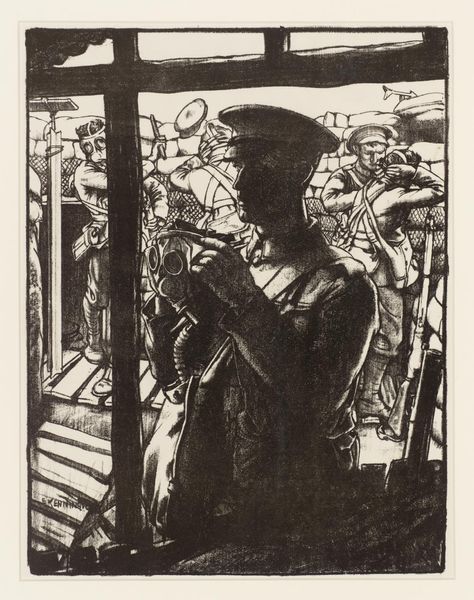 Curator: Here we have Eric Kennington’s “Making Soldiers: Over the Top,” a stark image held within the Tate Collections. Editor: It’s powerful. The heavy blacks and whites convey a sense of dread, like witnessing a desperate, chaotic surge. Curator: Indeed. Kennington, who also served in the war, captures the brutal reality of trench warfare, presenting soldiers emerging from the trenches and entering no-man’s land. It is a moment of forced masculine performance. Editor: And the symbolic weight of those rifles, almost like thorny growths, reflects the dehumanizing nature of conflict. They become extensions of the soldiers themselves. Curator: It’s as if they are shackled to it, unable to escape the violence. This work demands that we reassess narratives of heroism often associated with war. Editor: It leaves one with a heavy heart, acknowledging the countless lives irrevocably altered.