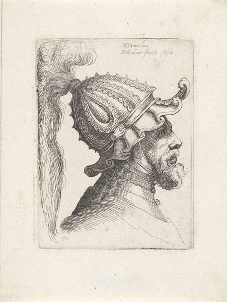 Curator: Here we have "Head of a Man, Wearing a Helmet, Profile Left," by Benigno Bossi, an Italian artist who lived from 1727 to 1792. Editor: The texture is immediately striking. The roughness of the etching gives the subject a tangible, almost gritty feel. Curator: Indeed, Bossi was known for his printmaking, particularly etchings and engravings, often after works by other artists. These prints played a vital role in disseminating imagery and artistic ideas across Europe. Editor: Looking closely, you can see the careful labor in creating the armor's ornamentation. The material details, from the metal to the plume, suggest luxury and status. Curator: Bossi worked in various European courts, and his imagery would have helped legitimize and circulate particular images of power and prestige. Editor: It also speaks to the culture of military portraiture at the time and how armor became a symbol of power and aspiration. Curator: Absolutely. Bossi's work gives us insight into the visual strategies that shaped social and political identities. Editor: It’s fascinating to consider the role of printmaking in standardizing imagery and material aspirations across social classes.